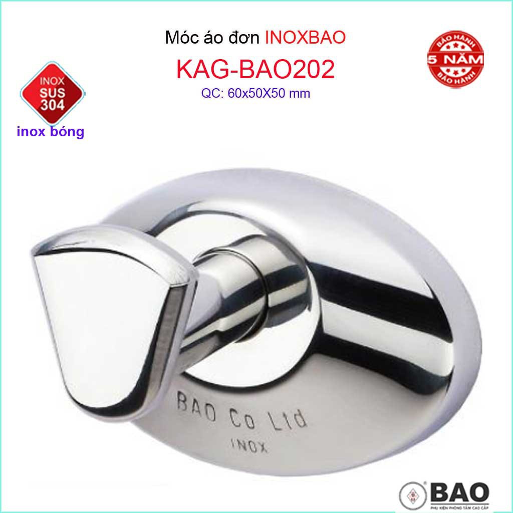 Móc treo đồ Inox Bảo, móc áo Inox SUS304 KAG-BAO202 làm bằng inox 304 chất lượng cao cấp với công nghệ hiện đại, thiết kế sắc nét từng góc cạnh, kỹ lưỡng đến từng chi tiết tạo nên 1 sản phẩm hoàn hảo thích hợp cho mọi phong cách phòng tắm.