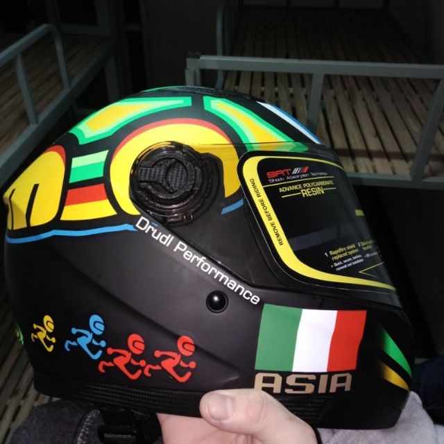 Mô tả sản phẩm Mũ bảo hiểm Fullface Asia MT136 tem rùa lai siêu chất kute hết nấc Kiểu Mũ : Fullface Màu mũ: tem rùa lai siêu chất Loại kính: 3 màu: trong suốt - tráng gương/ bạc- đen khói 1. Thân nón (vỏ nón): được làm từ nhựa ABS chính phẩm chịu được sự va đập mạnh và đâm xuyên cao. 2. Lớp đệm xốp bên trong dày, có bề mặt đanh chắc, vừa vặn và bám chặt vào thân nón có tác dụng hấp thụ xung động cao. 3. Dây đeo chắc chắn, khóa an toàn cao. 4. Nước sơn: được sơn bằng công nghệ hiện đại, tạo bề mặt sáng, bóng, nhẵn mịn, không ngã màu. 5. Kính nón: được xử lý bằng công nghệ NANO, cản tia UV, chống bám bụi, chống trầy xước, chống ố nhòe, đặc biệt không gây cận thị và nhức mắt cho người sử dụng. 6. Mũ có 1 size thích hợp với vòng đầu 57-59cm