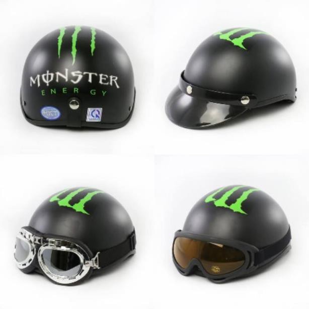 Mũ Bảo Hiểm Tem Monster, Nón Bảo Hiểm Đi Phượt Nửa Đầu Kèm Kính UV 400