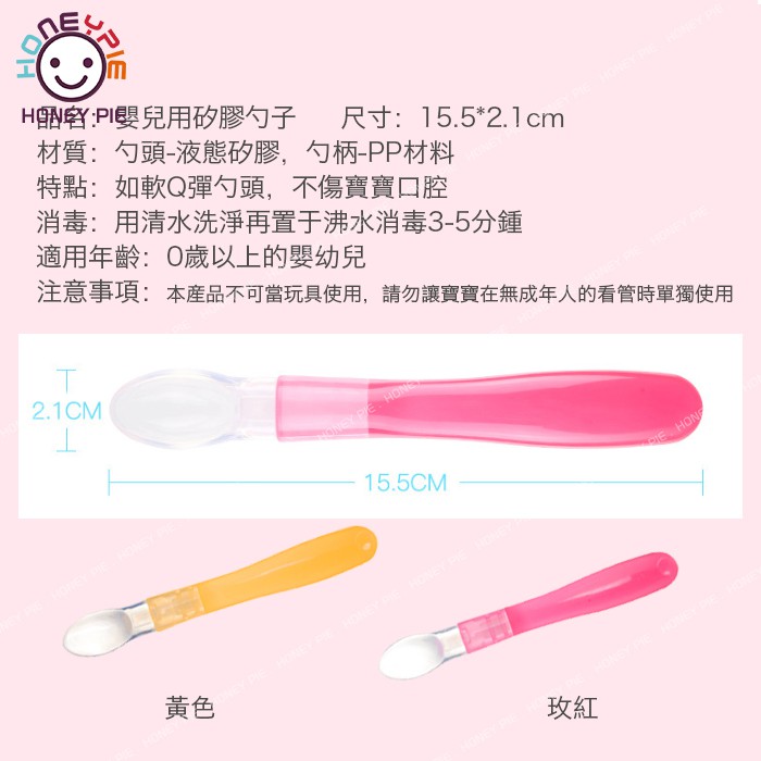 Product information Name: baby silicone spoon Material: spoon head - liquid silicone, spoon handle - pp material Size: 15.5x2.1 cm Features: soft q bullet spoon head, do not hurt baby oral cavity Disinfection: rinse with water and place it in boiling water for 3-5 minutes Applicable age: infants over 0 Note: this product should not be used as toys. do not let your baby use it alone without adult care