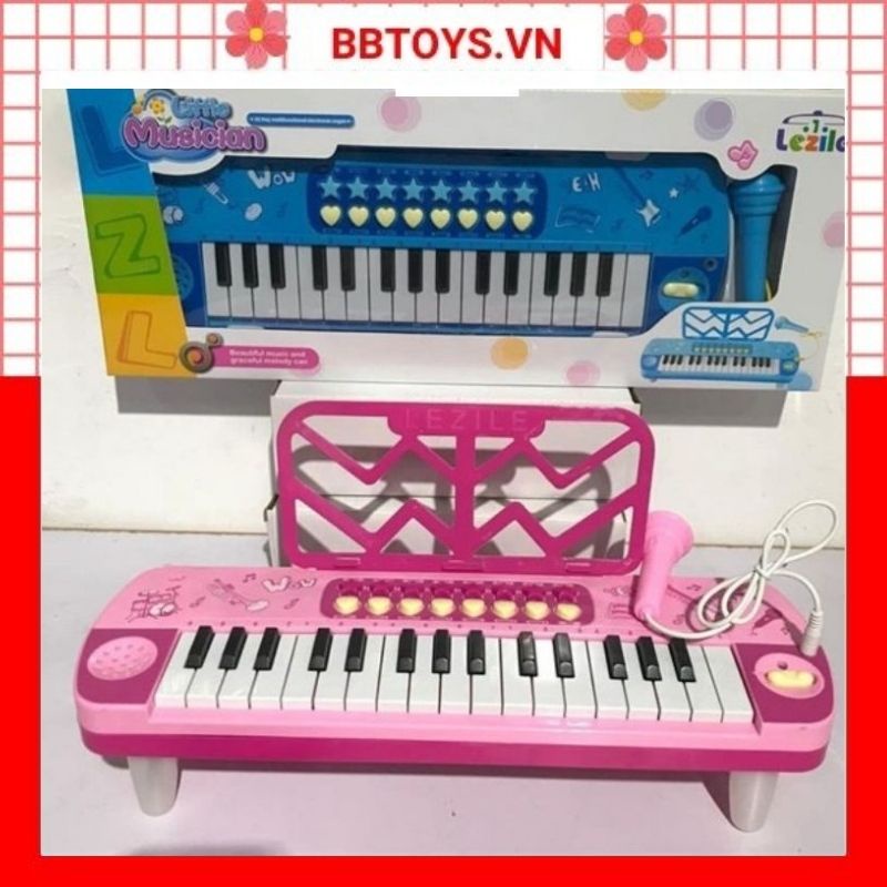Thông tin chi tiết và cách dùng: - Tên Sản phẩm: Đàn piano cho bé kèm mic đồ chơi có nhạc (tặng kèm 3 pin AA) (BBTOYS: 47) - Hình dáng như 1 chiếc đàn piano thật với 32 phím đàn và các chế độ có sẵn trong máy - Loa to rõ ràng, Có micro - Kích thước hộp 48x19x5cm, kích thước đàn: 39x16x13 cm - Bộ đàn piano cho bé bao gồm các phụ kiện: đàn, giá đỡ bài nhạc, micro, chân đế đàn. - Màu sắc: màu hồng và màu xanh da trời - Sản xuất tại TQ (hàng cao cấp) - Phù hợp cho bé từ 2 tuổi trở lên