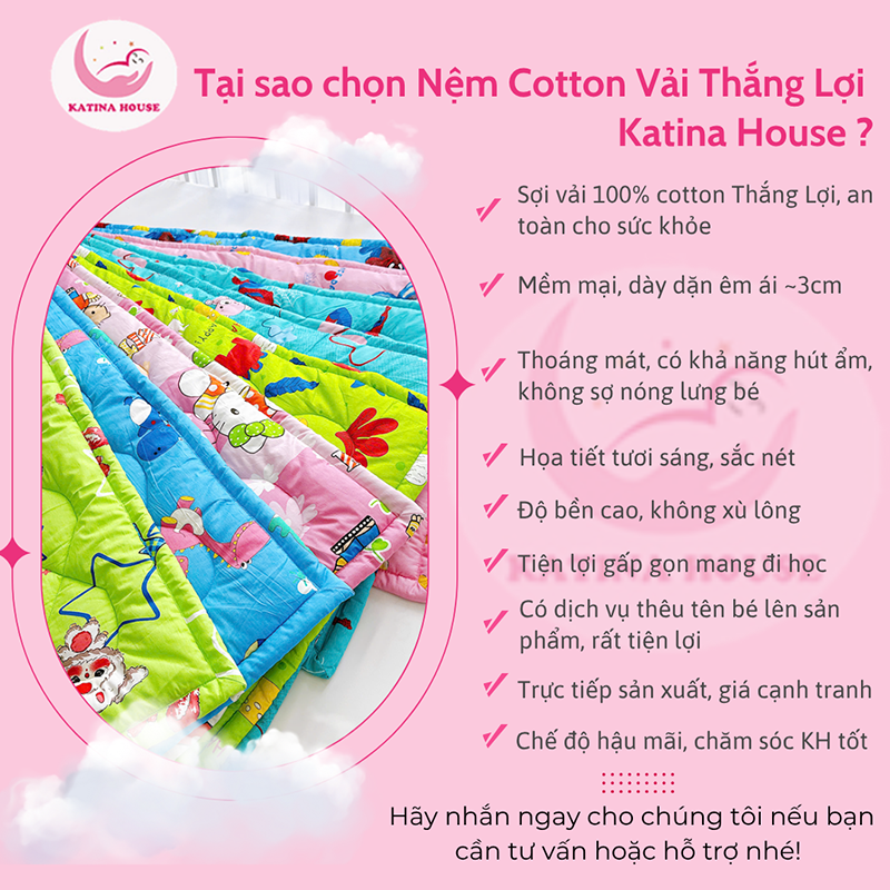 NỆM CHO BÉ ĐI HỌC MẪU GIÁO, NGỦ TẠI NHÀ VỚI CHẤT LIỆU COTTON THẮNG LỢI MỀM MÁT-GIÚP BÉ NGỦ NGON, GIÚP MẸ AN TÂM