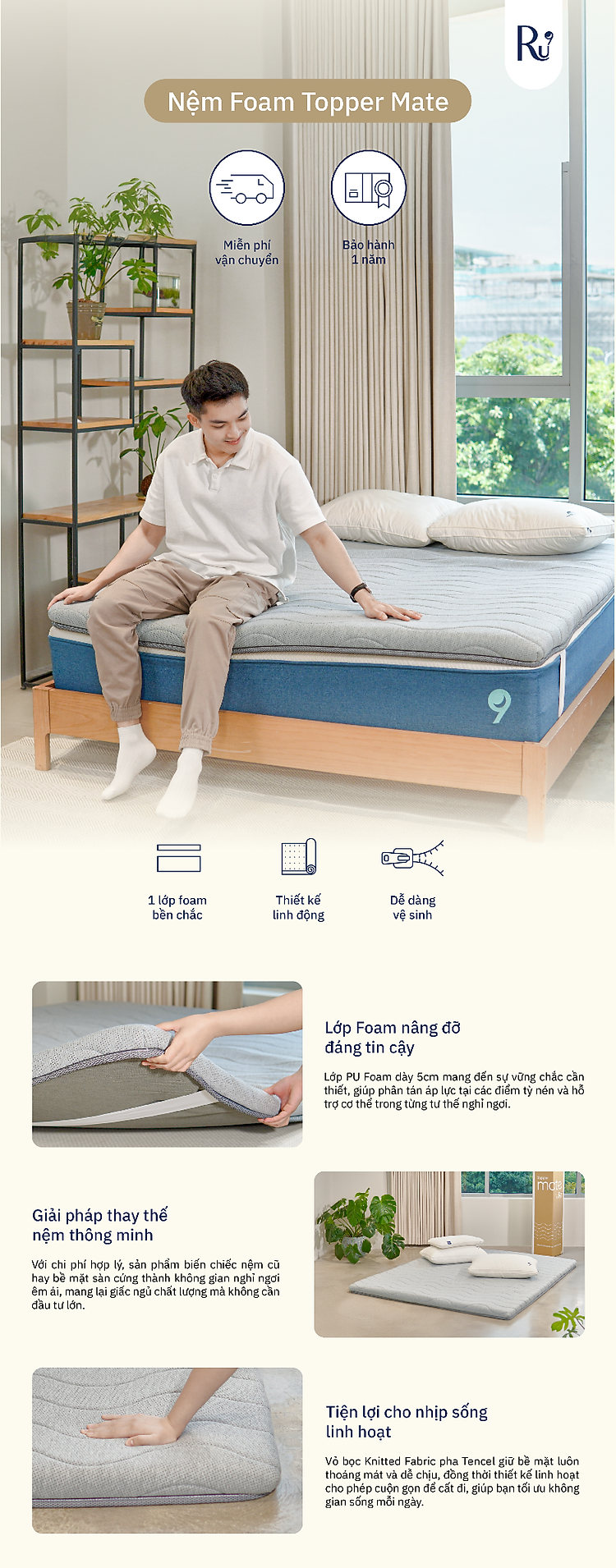 Thông tin sản phẩm: Foam Topper Mate Ru9 với lớp PU Foam dày 5cm mang đến giải pháp nâng cấp giấc ngủ trọn vẹn, đặc biệt phù hợp cho những ai muốn tối ưu chi phí hay sống trong không gian nhỏ gọn. Thiết kế nhẹ nhàng, dễ dàng di chuyển, giúp bạn tận hưởng sự linh hoạt và thoải mái ở bất kỳ không gian nào.