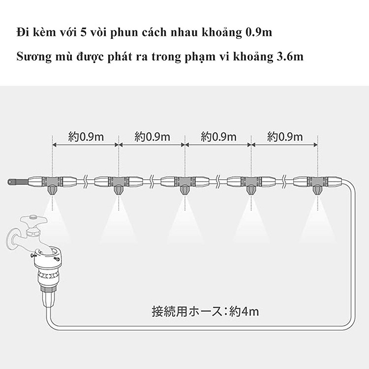 Lắp đặt dễ dàng – linh hoạt: Bộ ống dây dài 4m, các đầu phun dễ dàng lắp vào bất cứ vị trí nào theo nhu cầu phun mát – tưới cây – làm mát sân vườn.