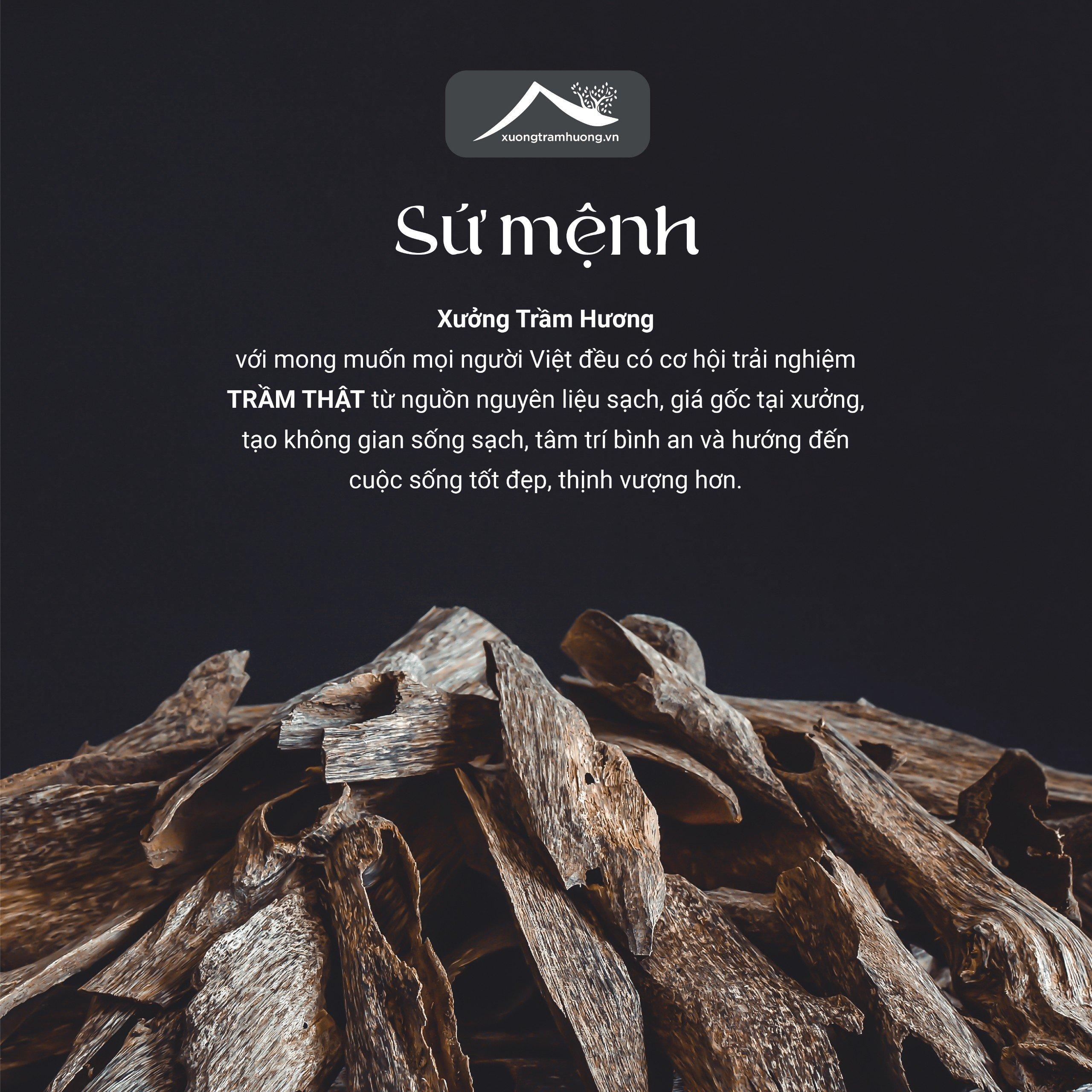 VI. Về thương hiệu Xưởng Trầm Hương Sứ mệnh: Xưởng Trầm Hương với mong muốn mọi người Việt đều có cơ hội trải nghiệm TRẦM THẬT từ nguồn nguyên liệu sạch, giá gốc tại xưởng, tạo không gian sống sạch, tâm trí bình an và hướng đến cuộc sống tốt đẹp, thịnh vượng hơn.