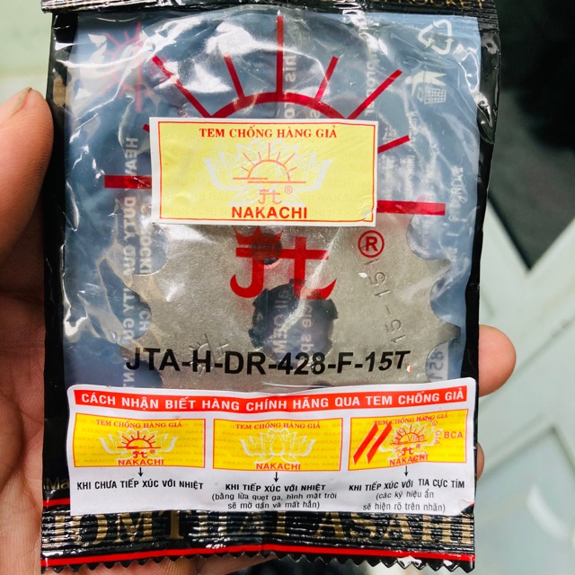 ✔ Cách kiểm tra hàng chính hãng - Bước 1 : Mở vỏ ngoài của hộp nhông sên dĩa mặt trời chính hãng, cào nhẹ lớp bạc trên tem chống hàng giả để lấy dãy kí tự - Bước 2: Soạn tin nhắn với nội dung là mã số, dãy kí tự trong tem chống hàng giả mặt sau bộ nhông sên dĩa mặt trời chính hãng gửi đến tổng đài 8077 Lưu ý: mỗi dãy số, kí tự chỉ có tác dụng cho một lần nhắn tin.