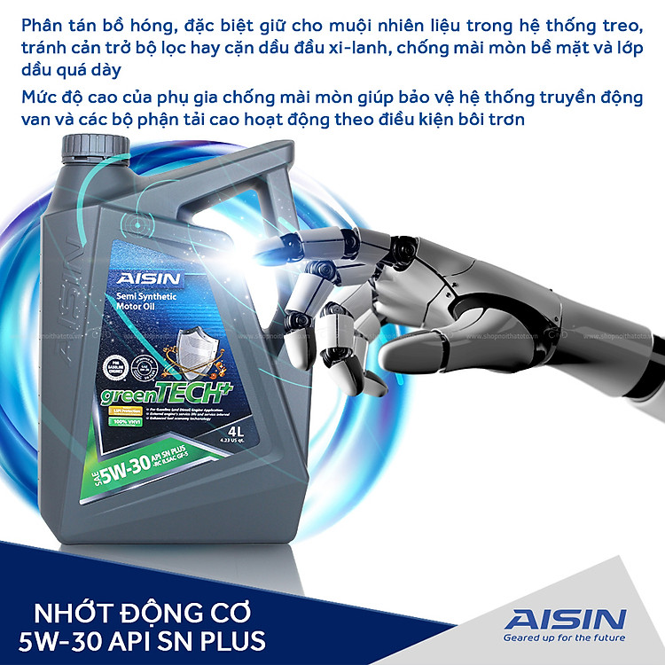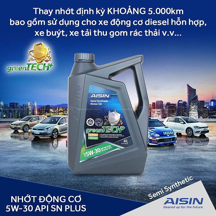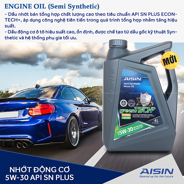 - Nhớt động cơ AISIN ESSN0354P 5W-30 SN PLUS greenTECH+ Semi Synthetic 4L là dầu nhớt bán tổng hợp chất lượng cao theo tiêu chuẩn API SN PLUS ECONTECH+, áp dụng công nghệ tiên tiến trong quá trình tổng hợp nhằm tăng hiệu suất. Dầu động cơ ô tô hiệu suất cao, ổn định, được chế tạo từ dầu gốc kỹ thuật Synthetic và hệ thống phụ gia tối ưu.