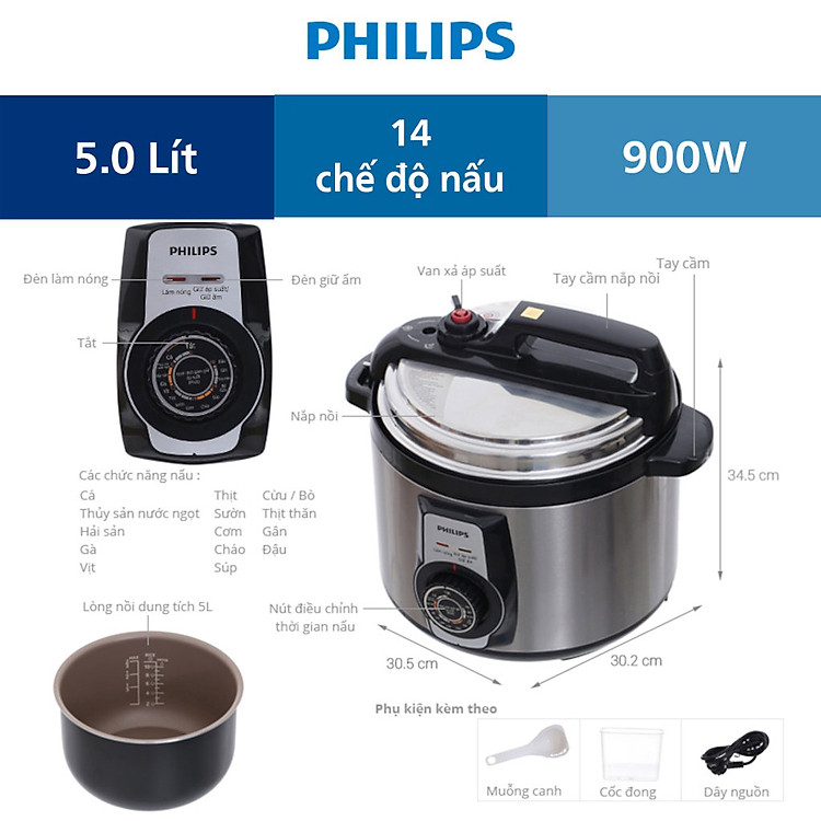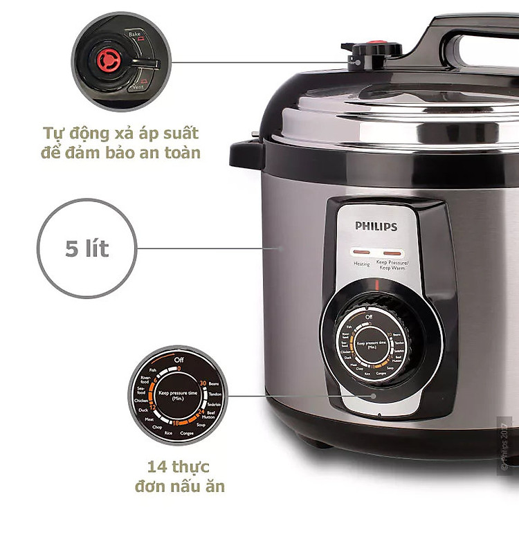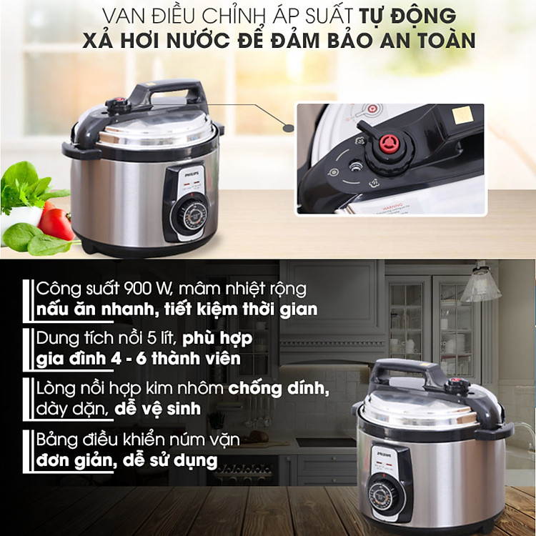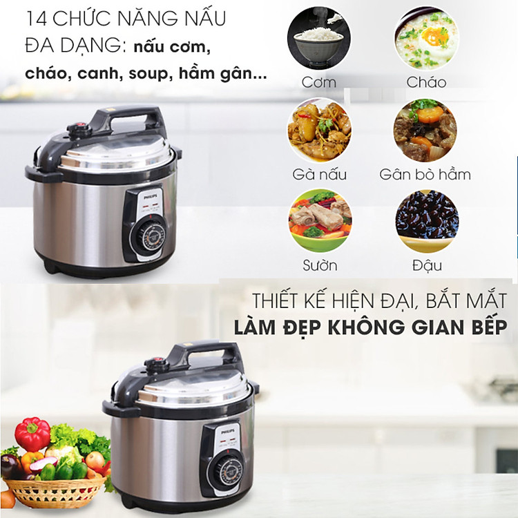 | Chất liệu | Nồi áp suất điện Philips HD2103/66 dung tích 5L, 14 chức năng nấu, chuẩn Châu ÂuModel:HD2103/66Thương hiệu:Philips Hà LanDung tích:5 lít – Có thể nấu nguyên con gà, phù hợp gia đình từ 4–6 ngườiCông suất:900W – Gia nhiệt nhanh, rút ngắn thời gian nấuBảng điều khiển:Dạng núm xoay cơ học, dễ điều chỉnh, hiển thị rõ ràng các chức năng với Nút vặn có tiếng ViệtCài đặt sẵn:14 chức năng nấuĐiện áp:220V - 50HzLòng nồi:Đường kính 22 cm - Dày 1.2 mmChiều dài dây điện:120 cmKích thước:Ngang 30.5 cm - Cao 34.5 cm - Sâu 30.2 cm |Nặng4.4 kgMàu sắc: Đen & bạcChất liệu:Lòng nồi hợp kim nhôm chống dính, vỏ ngoài Thép không gỉChế độ an toàn:Nắp nồi không mở ra được khi có áp suất cao, Van xả áp suất an toànPhụ kiện Bao gồm:Môi, Chén lường gạo, Lồng nồi chống dính, Kẹp gắp thức ănSản xuất tại:Trung QuốcBảo hành 24 tháng chính hãngPhilips Việt NamĐặc điểm nổi bật-Nồi áp suất điện Philips HD2103/66kiểu dáng hiện đại, bắt mắt, giúp làm đẹp không gian dùng. Vỏ ngoài bằng thép sơn tĩnh điện, dung tích 5 lít thích hợp dùng cho mọi gia đình thực hiện các món hầm, tiềm...-Nồi áp suất công suất 900 W, mâm nhiệt lớn và phẳng gia nhiệt tốt, nấu ăn nhanh- Lòng nồi bằng hợp kim nhôm chống dính bền tốt, an toàn, dễ vệ sinh- Điều khiển bằng núm vặn đơn giản:Menu nấu tự động bao gồm 14 món như nấu cơm, nấu cháo, nấu canh, nấu soup, nấu sườn, nấu gà... Có hẹn giờ nấu, giúp người dùng rảnh tay để làm việc khác.- Van xả áp suất cao tự động xả áp khi áp suất trong nồi vượt mức quy định, giúp giảm áp an toàn, chống trào nổ,... có thể tháo rời vệ sinh- Nồi có van khóa ngăn không cho mở nắp nồi khi trong nồi còn áp suất, an toàn tối đa khi sử dụng- Nồi áp suất điện tử Philips HD2103/66 sản phẩm chất lượng tốt từ thương hiệu uy tín, dễ sử dụng, đáng chọn dùng cho bếp gia đình.Chức năng nấu:Nấu bò/cừuNấu đậuNấu thịtNấu sườnNấu hải sảnNấu gânNấu gàNấu cơmNấu cáNấu cháoSúpNấu vịtThủy sản nước ngọtThịt thănTiện ích và an toàn:- Hẹn giờ nấu lên đến 24 tiếng- Giữ ấm tự động lên đến 12 tiếng- Tự động xả áp suất khi kết thúc nấu – an toàn tuyệt đối cho người dùng- Khóa bảng điều khiển – an toàn với trẻ nhỏ- Cho phép thêm nguyên liệu giữa quá trình nấu bằng một nút bấm, tự động xả áp và tiếp tục nấu sau khi nắp đóng lại- Chất liệu vỏ ngoài bằng thép không gỉ cao cấp, phủ kim loại đen sang trọng, dễ lau chùi |