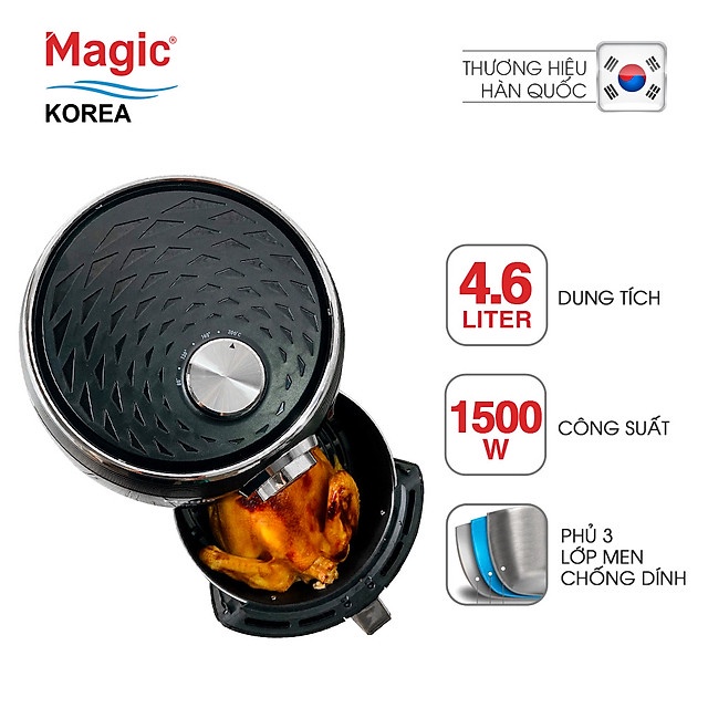 Thiết kế nhỏ gọn, sang trọng Nồi Chiên Không Dầu Magic Korea A-802 với thiết kế hiện đại, gam màu đen sang trọng, kiểu dáng nhỏ gọn kết hợp các đường nét cong nhẹ nhàng và tinh tế, tạo nên 1 sản phẩm đẹp ngoài sự mong đợi. Nồi có dung tích siêu lớn lên đến 4.6L, giúp bạn thoải mái chiên nướng nhiều thực phẩm hơn so với nhưng nồi chiên dung tích nhỏ khác. Công nghệ đốt nóng chân không Rapid Air Đặc biệt với cơ chế hoạt động sử dụng công nghệ đót nóng châng không Rapid Air, phần quạt phía trên phần trong nồi sẽ thổi ra luồng không khí nóng, sau đó dòng khí nóng lên đến 200 độ C này sẽ lưu chuyển tuàn hoàn ở tốc độ nhanh và mạnh quanh vỉ thức ăn để chiên giòn đều thức ăn bằng không khí thay vì dầu mỡ như bình thường. Còn những loại thực phẩm có mỡ có thể giảm tới 80% lượng hất béo so với kiểu chiên thông thường trên chảo mà vẫn đảm bảo hương vị thơm ngon tự nhiên. Công suất cực lớn Nồi chiên được hoạt động với công suất lên đến 1400W giúp chiên rán và làm chín khối lượng thực phẩm lớn và những thực phẩm lâu chín nhất như gà nguyên một khoảng thời gian ngắn hơn, giúp tiết kiệm 30% thời gian nấu, cho nên lượng điện năng tiêu thụ cũng tiết kiệm được 1/2 so với bình thường. Tính năng lọc mùi, giảm khói hiệu quả Bên cạnh đó với tính năng lọc mùi giảm khói, bạn sẽ không phải lo ngại thức ăn bị lẫn mùi vị của nhau. Khi chiên với nhiệt độ cao thì mùi của thực phẩm được hút ra bên ngoài, không bị tích tụ lại bên trong khoảng hẹp của lòng nồi nên thực phẩm sau khi chế biến sẽ có mùi vị thơm ngon hơn và không bị nồng. Hơn nữa bộ lọc mùi và đặc điểm không sử dụng dầu mỡ của nồi chiên không dầu giúp bạn nấu nướng được sạch sẽ hơn, sau khi nấu bạn sẽ không còn tình trạng quần áo hay đầu tóc am mùi của thức ăn nữa, khu vực bếp ăn cũng sẽ không bị bắn những vệt dầu bẩn cứng đầu. Chế biến đa dạng thực phẩm Ngoài khả năng làm các món chiên rán như gà chiên, chả giò, nem chua rán, khoai tây chiên, tôm lăn bột, khoai lang hay thậm chí làm bỏng ngôản phẩm còn có thể tận dụng để nướng bánh sandwich, bánh quy ròn, sấy khô thực phẩm như mít sấy, hoa quả sấy, cơm dừa sấy, bất cứ lúc nào chỉ với 2 nút điều chỉnh. Chất liệu cao cấp Nồi được làm bằng chất liệu nhựa PP cao cấp có khả năng chịu nhiệt và chịu lực cao làm sản phẩm trở nên sang trọng và tạo cảm giác sạch sẽ vệ sinh hơn, phần lòng nồi bằng chất liệu thép không gỉ phủ thêm 3 lớp chống dính thích hợp nấu nướng mọi loại thực phẩm mà không gây kết dính. Dễ dàng vệ sinh với thiết kế khay rán phủ lớp chống dính bên trong giúp bạn có thể tháo ra và lau rửa rất nhẹ nhàng.