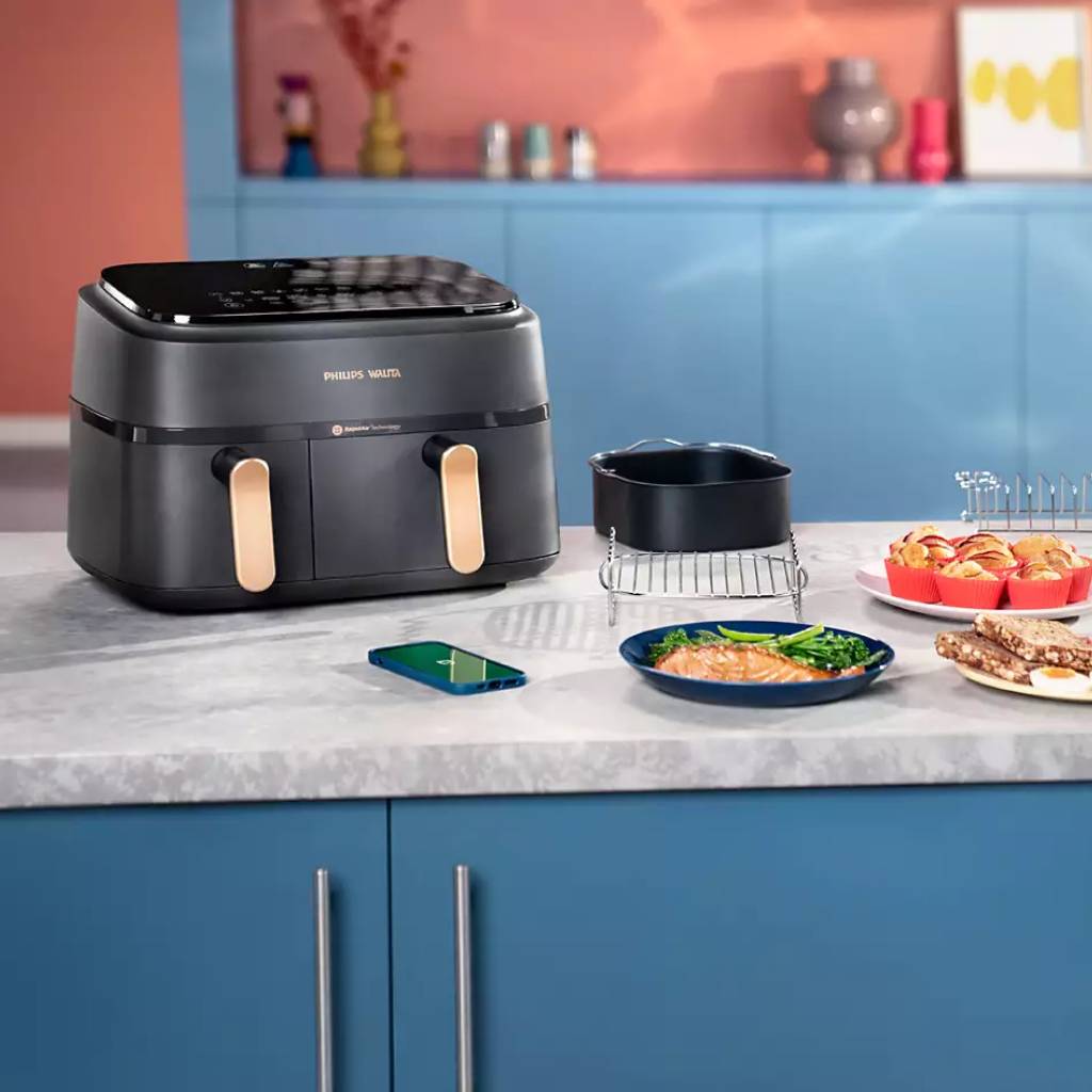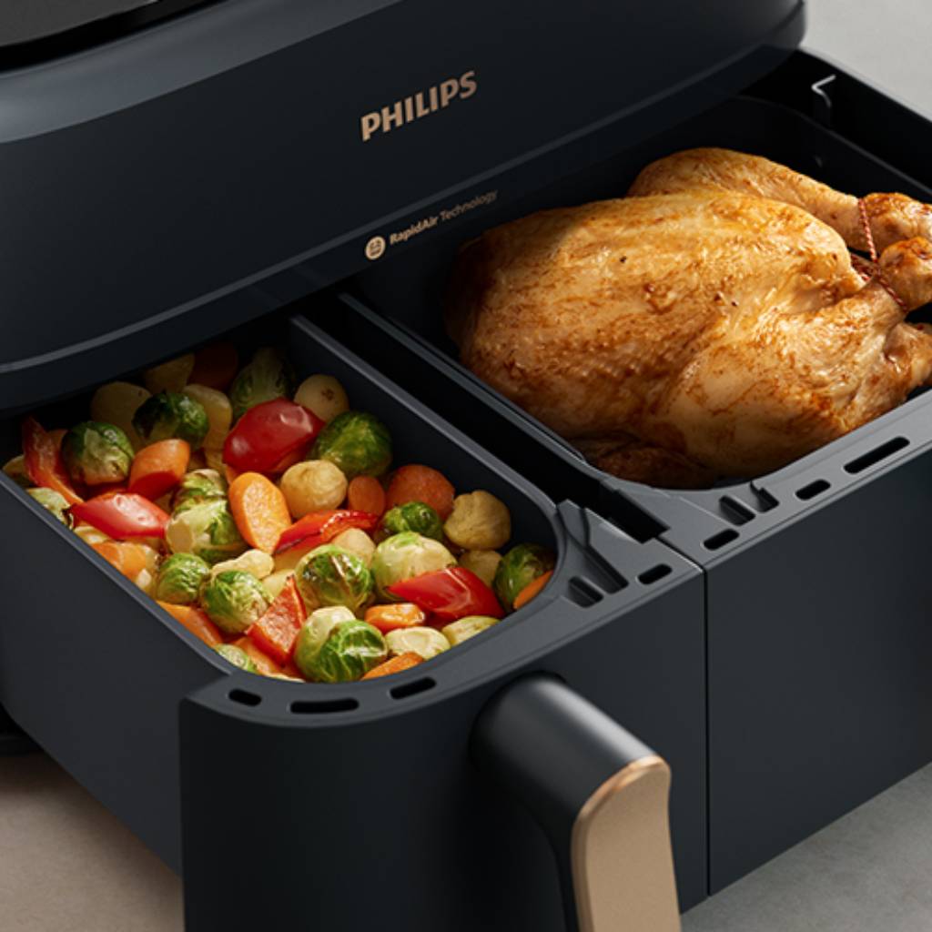 Với thiết kế 2 ngăn độc đáo, dung tích lớn, kết hợp công nghệ Rapid Air Plus cùng nhiều chương trình nấu ăn cài đặt sẵn tiện lợi, nồi chiên không dầu Philips NA352/00 9 lít sẽ là một trợ thủ đắc lực giúp bạn chuẩn bị các bữa ăn gia đình hoặc những buổi tiệc nhỏ một cách dễ dàng và nhanh chóng.