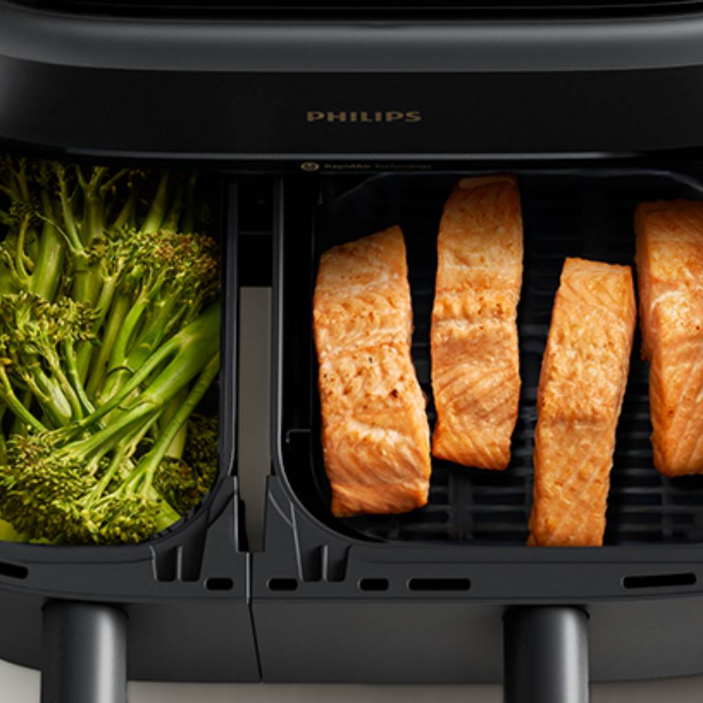 Khác với những chiếc nồi chiên thông thường, nồi chiên không dầu Philips NA352/00 có thiết kế 2 ngăn độc đáo cho phép người dùng nấu 2 món ăn cùng một lúc, giúp tiết kiệm thời gian và năng lượng.