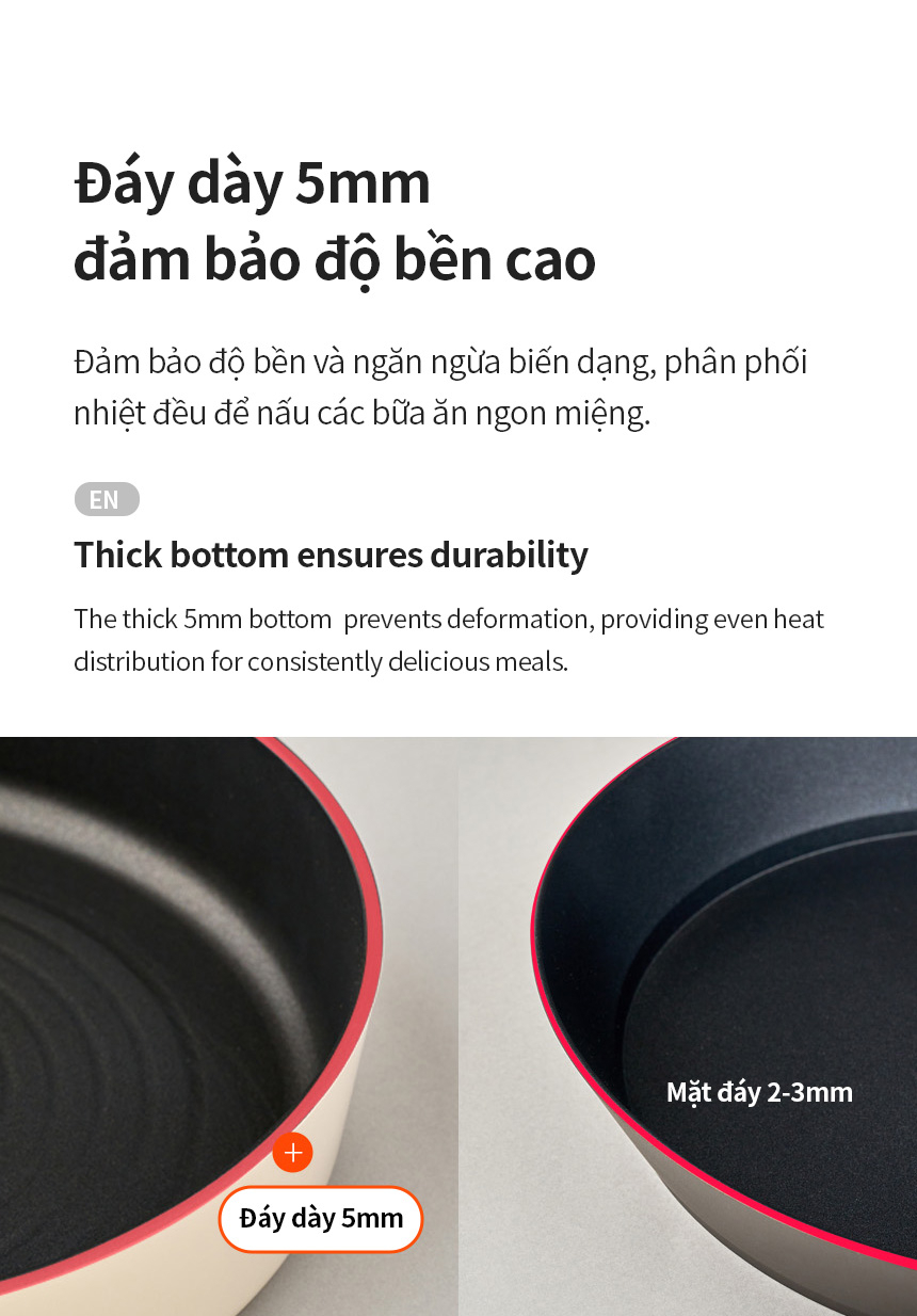 HỆ THỐNG KHÓA DẦU: Độ dày 3.5T tối ưu cùng thiết kế đường tròn rãnh trên bề mặt giúp ngăn sự biến dạng, phân bố dầu đều khắp bề mặt chảo.