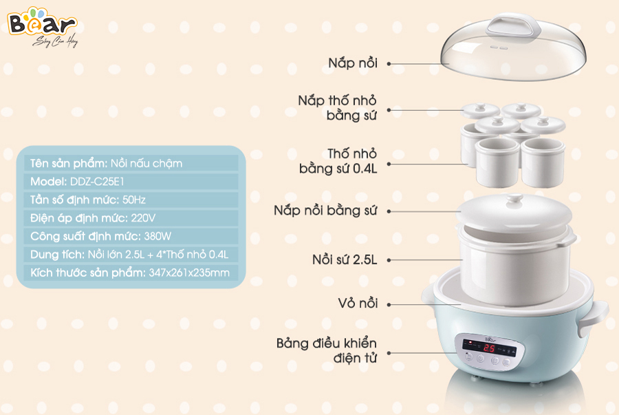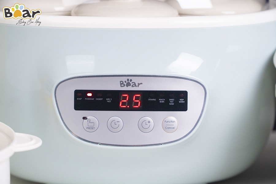 Nồi Nấu Cháo Chậm 2.5L Bear DDZ-C25E1 (SUBE003) phiên bản quốc tế với thiết kế thông minh, tích hợp 5 lõi sứ thông minh cho phép bạn chế biến nhiều món ăn cùng lúc. Với dung tích nấu lớn lên đến 2.5l thì bạn hoàn toàn có thể sử dụng nấu cháo cho bé hoặc nấu cháo cho cả gia đình sử dụng vô cùng tiện lợi. Hãy cùng tìm hiểu về sản phẩm nồi nấu cháo chậm Bear 2.5l ngay dưới đây nhé!