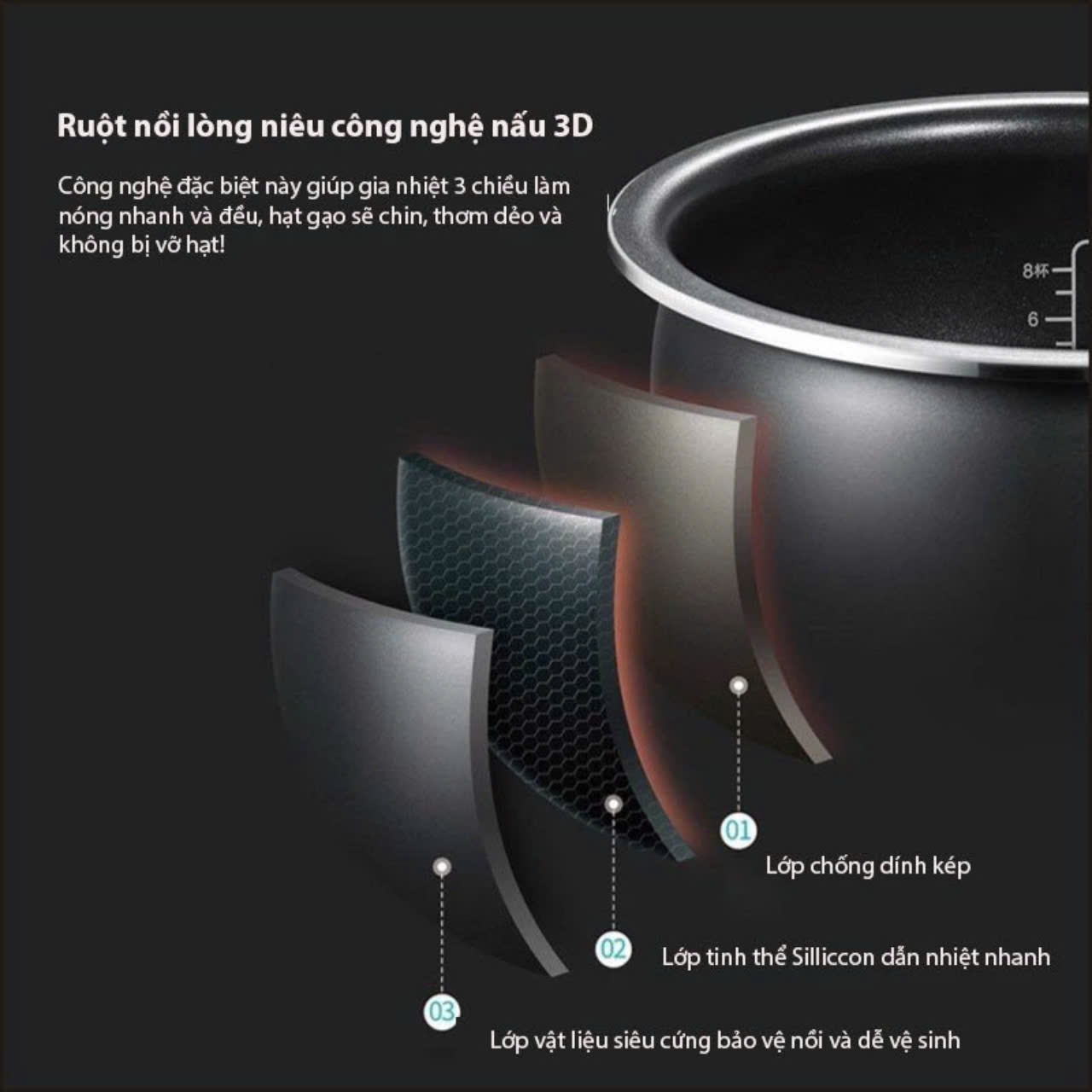 - Công nghệ nhiệt 3D giúp cơm chín đều và nhanh hơn.