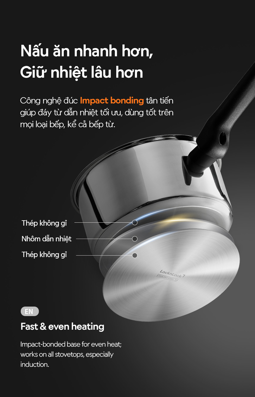 - TRUYỀN NHIỆT NHANH VÀ ĐỀU: Công nghệ đúc Impact bonding tân tiến giúp đáy từ dẫn nhiệt tối ưu, dùng tốt trên mọi loại bếp, kể cả bếp từ