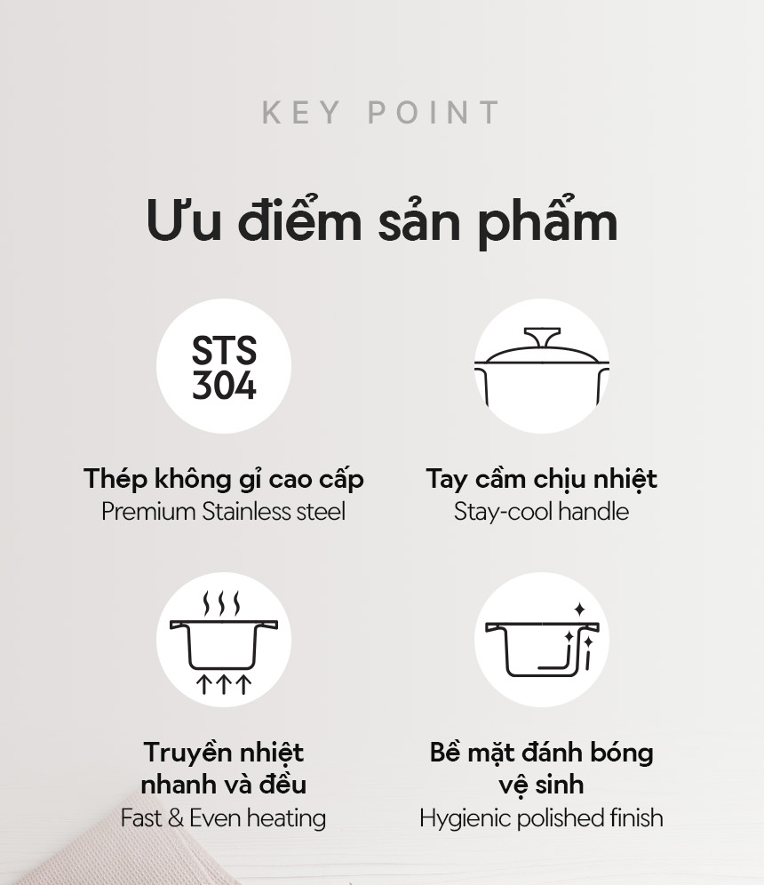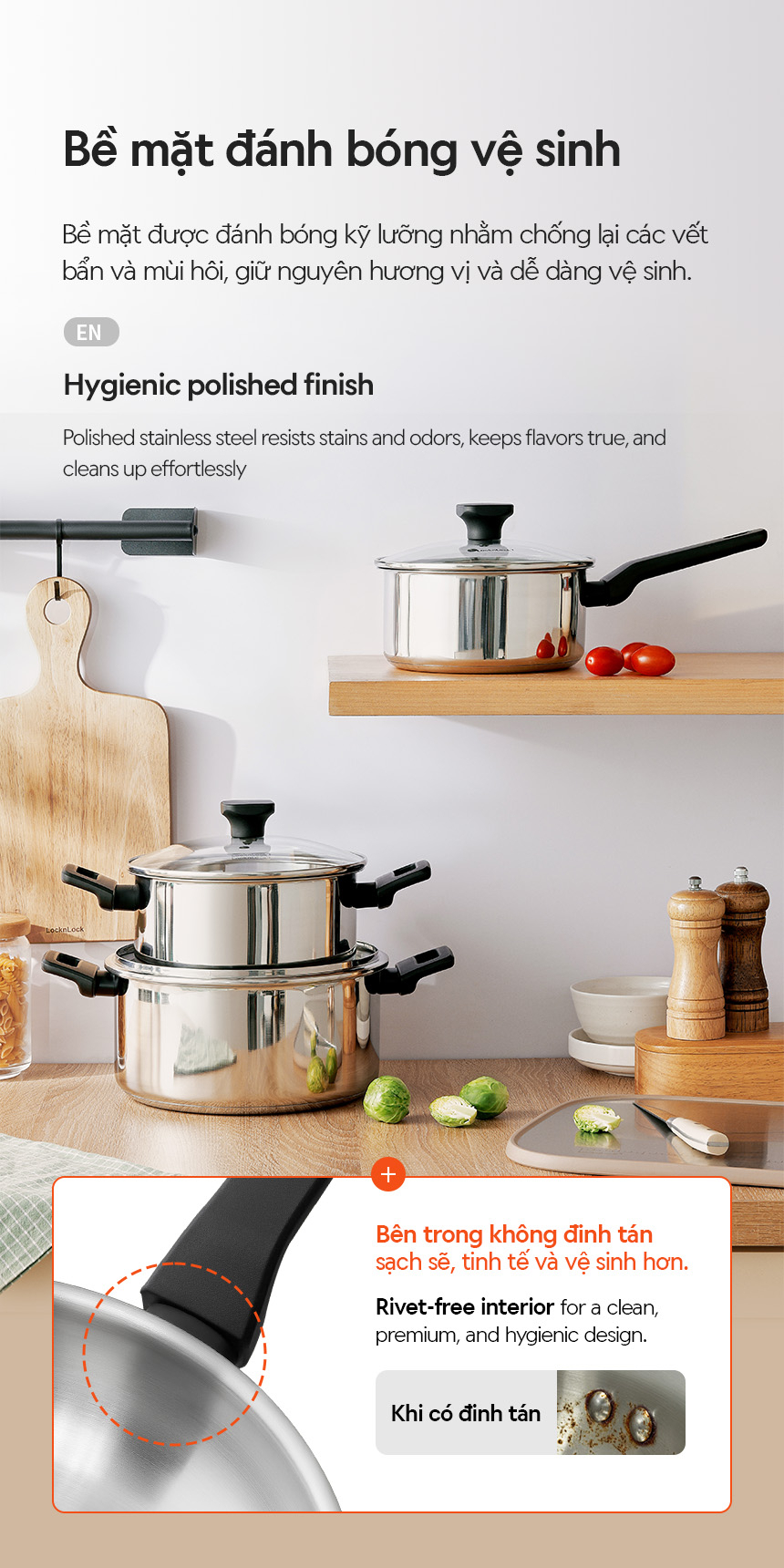 - DỄ NẤU, DỄ VỆ SINH: Bề mặt được đánh bóng kỹ lưỡng nhằm chống lại các vết bẩn và mùi hôi, giữ nguyên hương vị và dễ dàng vệ sinh