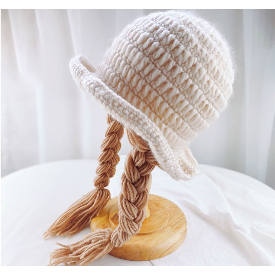 Thời trang trẻ em & trẻ sơ sinh > Phụ kiện trẻ em & trẻ sơ sinh > Mũ & mũ lưỡi trai || Nón len tóc giả tết bím cho bé, mũ len ajuma Hàn Quốc cho trẻ 6 tháng - 3 tuổi