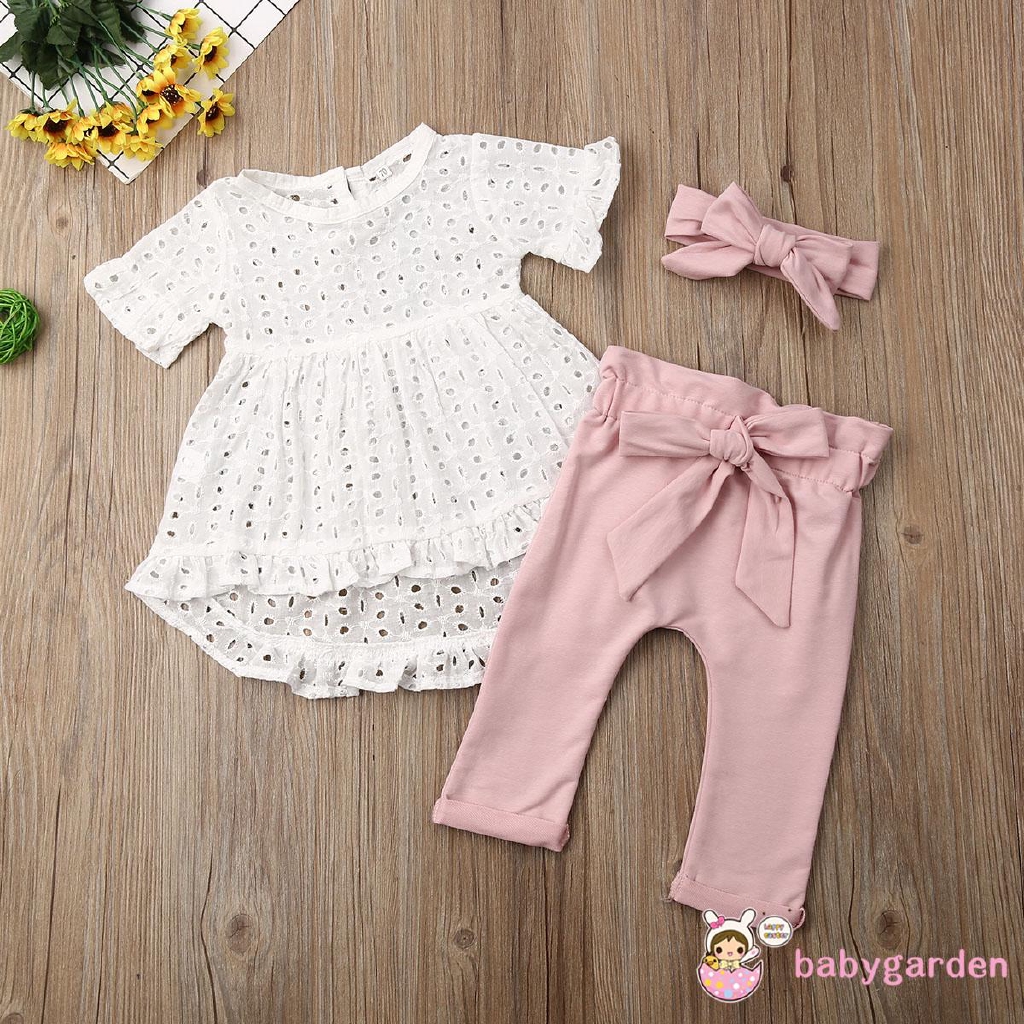 Bộ trang phục 3 mảnh áo thun ren + quần dài cạp cao cột nơ + băng đô xinh xắn cho bé gái Bộ đồ cho bé gái sơ sinh đáng yêu!!
