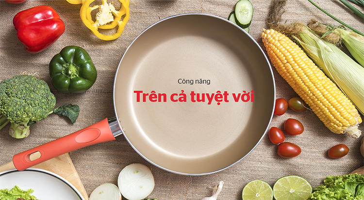 Màu sắc tươi sáng, bắt mắt: Chảo được phủ ngoài bởi lớp sơn tĩnh điện màu cam sáng bóng có khả năng hạn chế trầy xước và bám bẩn; lòng chảo phủ chống dính màu nâu đỏ đem lại tổng thể tươi sáng phù hợp với không gian căn bếp hiện đại.