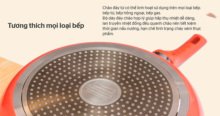 Sử dụng được trên mọi loại bếp: Chảo được cấu tạo đáy từ nên sử dụng được trên mọi loại bếp: bếp từ, bếp gas, bếp hồng ngoại.
