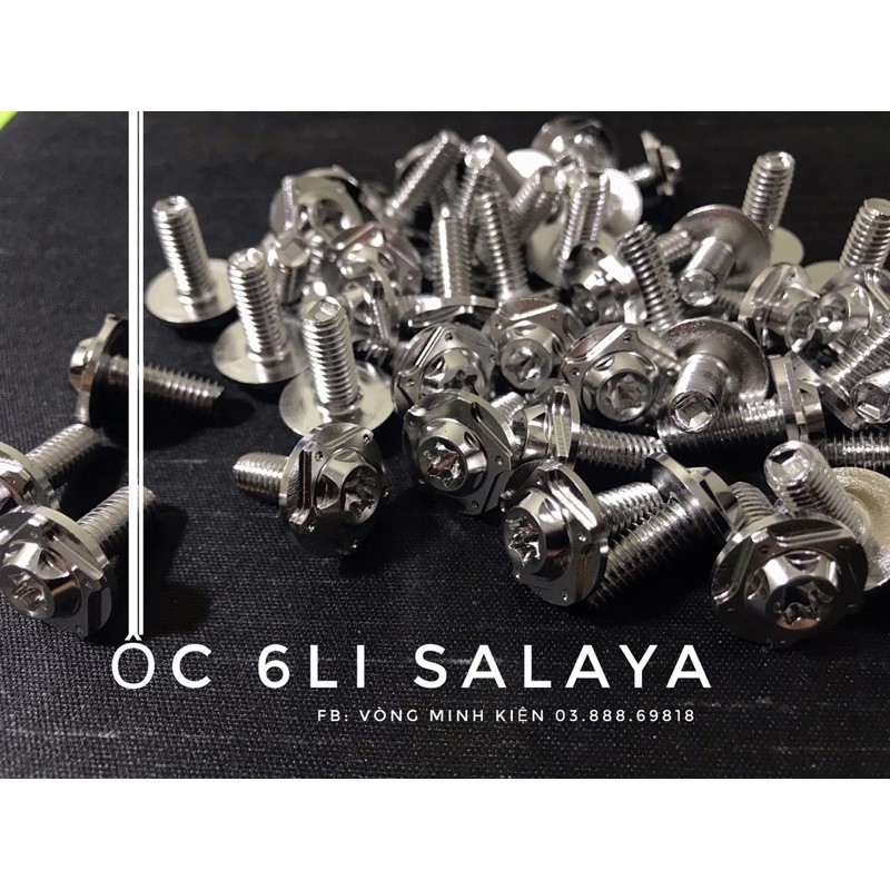 Ốc dàn áo Salaya Loại ốc sử dụng cho dàn áo của xe máy cần ốc có tính bền bỉ, chống va đập và chịu được nhiệt độ và loại ốc Salaya này làm được việc đó nên được đưa vào sử dụng cho dàn áo xe máy rất tốt. Ốc dành cho dàn áo se có kích thước vừa, không quá dài cũng không quá ngắn, màu sắc của loại này là màu bạc hoặc là màu nguyên thủy của kim loại, phần đầu có hình ngôi sao 5 cánh cùng miếng bạc dẹp hình tròn, nhìn vào rất dễ nhận biết đây là loại ốc dành cho xe độ và dùng chủ yếu cho dàn áo phía trước hoặc dàn áo xung quanh xe, ngoài ra phần đuôi không nhọn nên dễ siết chặc dàn áo của xe hơn. Chính điều này mà bạn không thể bỏ qua cơ hội để mua dùng ốc dàn áo Salaya này sử dụng cho xe của mình.