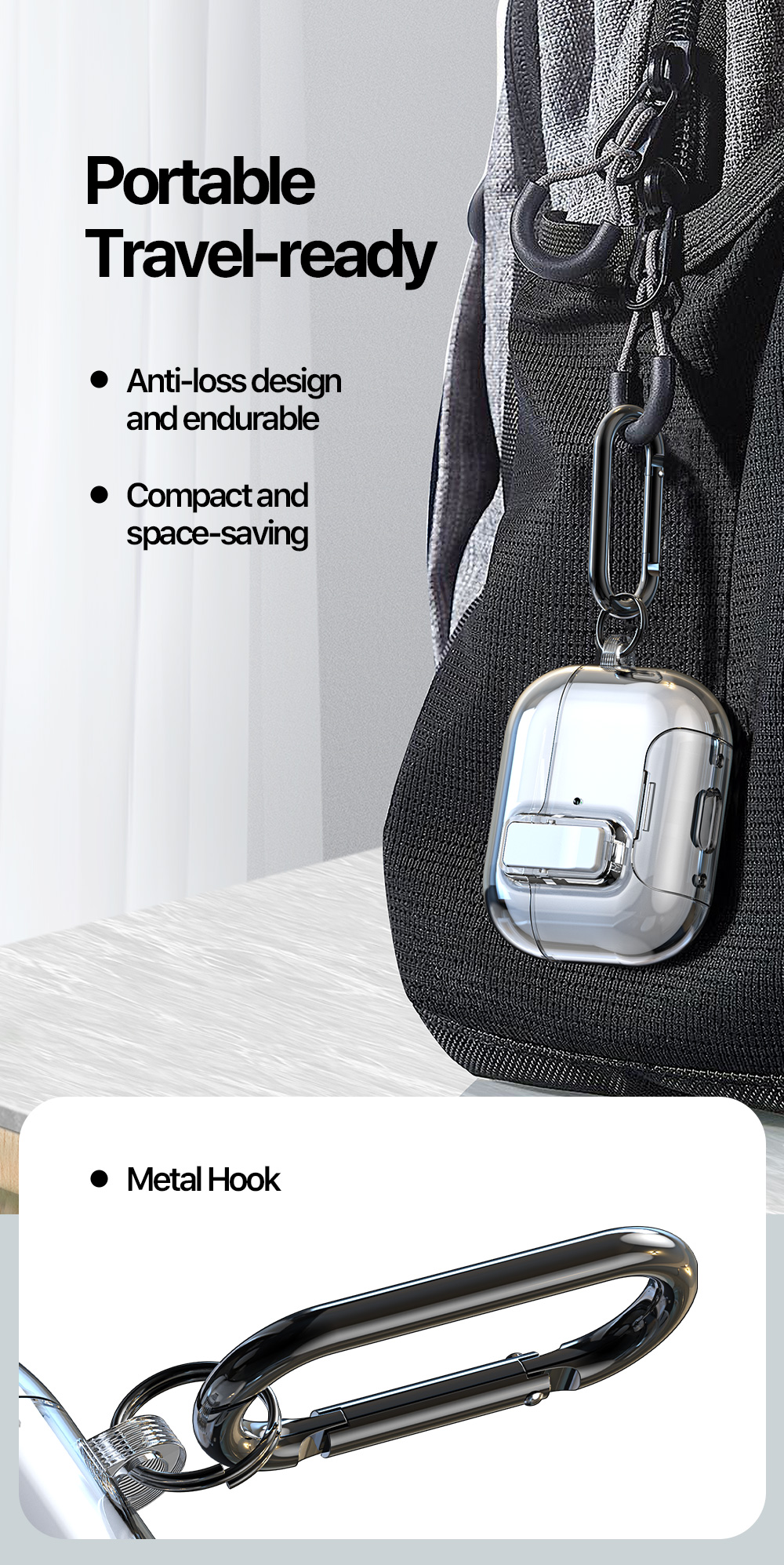 Cổng chống bụi hình đuôi cua + móc kim loại chống thất lạc để dễ dàng mang theo