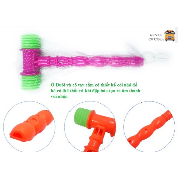 THÔNG TIN SẢN PHẨM: Sản phẩm được làm từ nhựa PP an toàn cho bé và thân thiện với môi trường Đầu búa được thiết kế nhựa mềm uốn dạng lò xò, đập nẩy Tay cầm của búa được kết hợp với một kèn ở cuối giúp sản phẩm sinh động hơn, tạo ra những âm thanh vui nhộn kích thước sản phầm: 23x11cm Màu sắc bắt mắt, tươi sáng và có độ bền cao - giúp bé vui chơi giải trí cùng bạn bè - tăng khả năng vận động , và sáng tao , bé có thể tạo ra những bản nhạc, âm thanh vui nhộn của riêng minh khi chơi