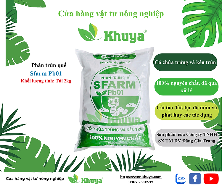 Phân trùn quế cao cấp Sfarm Pb01 vẫn chứa nhiều trứng trùn và kén trùn trong phân nên có tác dụng tốt trong cải tạo đất, tạo độ mùn và phát huy tất cả các tác dụng vượt trội vốn có của phân trùn quế. Ngoài ra, do phân đã được xử lý nên mịn hơn và có độ ẩm lý tưởng cho việc bón phân cũng như lưu trữ và bảo quản. Điều này giúp cho Sfarm Pb01 dễ bón, giảm công bón, dễ vận chuyển và tối ưu chi phí hơn so với Sfarm Pb00.