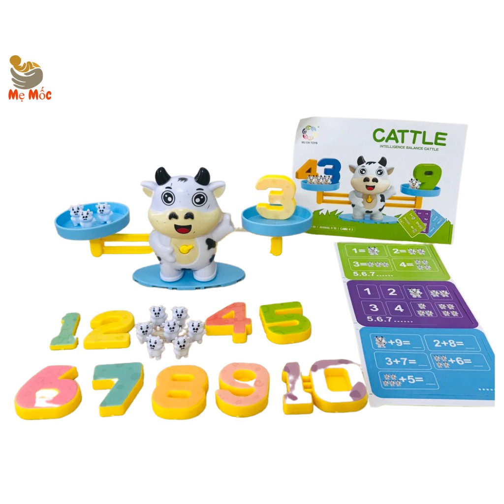 Chất liệu : nhựa Bao gồm : 1 con bò to làm trụ cân 2 đĩa cân 10 con bò nhỏ Số 1,2,3,4,5,6,7,8,9,10 3 tờ giấy hướng dẫn bé