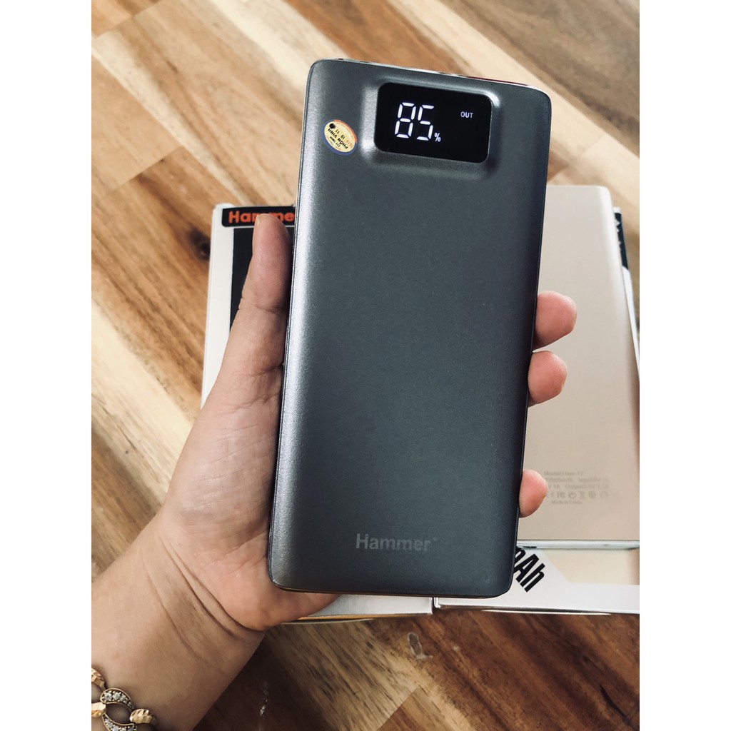 Pin dự phòng Hammer 12.000mAh màn hình LCD Dung lượng: 12.000mAh Model: Ham-LCD12 Tương thích: iPhone, điện thoại, máy ảnh, Ipad, máy nghe nhạc, máy ghi âm có cổng sạc micro USB tương thích. Trọng lượng: 260g Kích thước: 165 x 74 x 17 mm Nguồn vào: DC5.0V-2A, Nguồn ra: 1: DC5.0V-1A., 2: DC5V-2.1A (Max) Vòng đời: Trên 500 lần sạc Màu sắc: Đen, Vàng đồng Thời gian sạc: Khoảng 12-15 tiếng (Dùng sạc 2A) Cổng sạc: Chuẩn Micro USB Pin dự phòng Hammer 12.000mAh có màn hình LCD hiển thị dung lượng và tỷ lệ % của pin sử dụng cho điện thoại, máy tính bảng, máy ảnh, máy ghi âm; Được thiết kế cho Smart Phones, máy ảnh kỹ thuật số, iPhone v.v.., những thiết bị kỹ thuật số cầm tay khác và cung cấp nguồn điện lý tưởng vào bất cứ lúc nào, bất cứ đâu cho người dùng. Kết cấu tuyệt đẹp với kiểu dáng chắc chắn, thời trang. #pinduphong #hammer