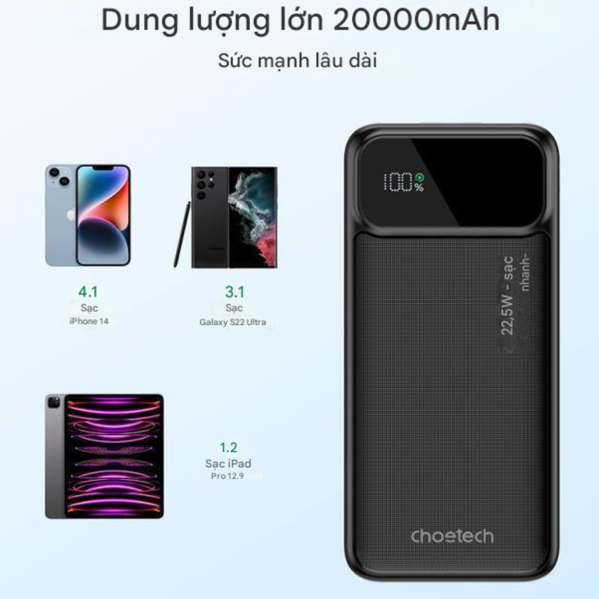 – Choetech B729 – 20000mAh:Phiên bản cân bằng giữa dung lượng và tính di động, phù hợp với những người có nhu cầu sử dụng nhiều thiết bị hoặc di chuyển thường xuyên, mang đến nguồn năng lượng dự phòng đáng tin cậy cho công việc và giải trí.