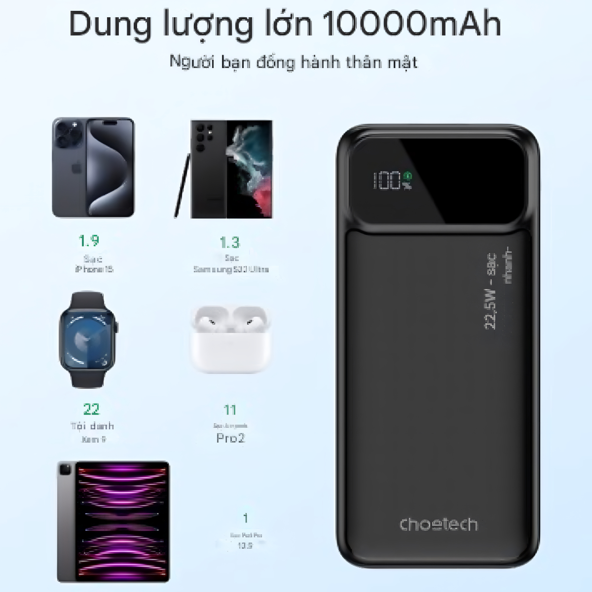 – Choetech B728 – 10000mAh:Lý tưởng cho nhu cầu sử dụng hàng ngày, mẫu pin nhỏ gọn giúp đáp ứng các tình huống sạc khẩn cấp và di chuyển nhanh chóng, đảm bảo thiết bị của bạn luôn hoạt động ổn định trong suốt cả ngày.