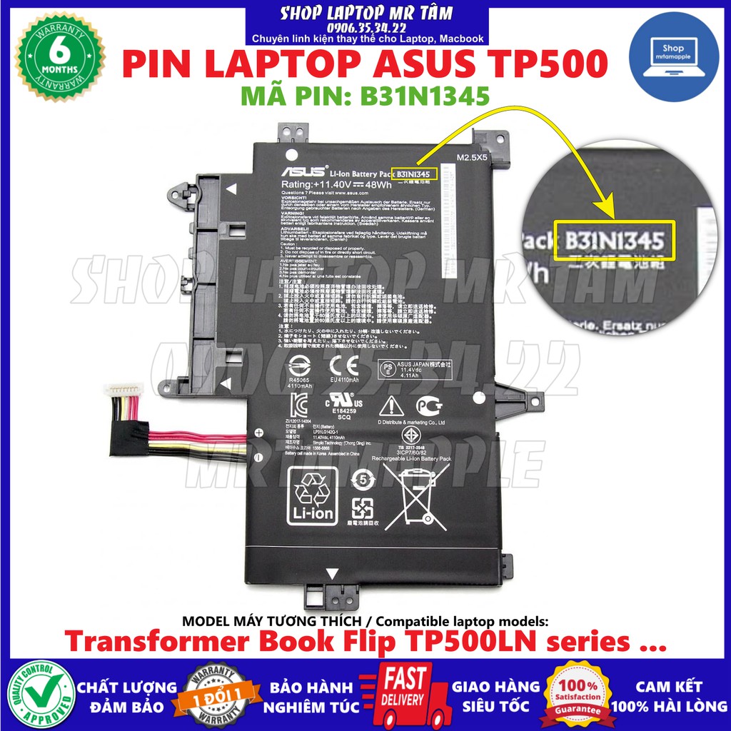 Lưu ý: danh sách model laptop dùng chung pin này có thể chưa được cập nhật đầy đủ 👉👉👉Pin Laptop ASUS TP500 (B31N1345)(ZIN) - 3 CELL sử dụng chung cho các dòng: Transformer Book Flip TP500LN + MÃ PIN TƯƠNG THÍCH / Part numbers: B31N1345 + MODEL MÁY TƯƠNG THÍCH / Compatible laptop models: Transformer Book Flip series: TP500LA TP500LB TP500LB-DN024H TP500LB-DS71T-CA TP500LN TP500LN-0041A4210U TP500LN-CJ035H TP500LN-CJ132H TP500LN-CJ142D TP500LN-DB51T-CA TP500LN-DN057H TP500LN-DN064H TP500LN-DN066D TP500LN-DN066H TP500LN-DN075H TP500LN-DN109H TP500LN-DN119H TP500LN-DN136H còn nữa... =============== QUÝ KHÁCH LƯU Ý SO SÁNH KỸ ĐỂ CHẮC CHẮN MUA ĐÚNG PIN: ✔️MÃ PIN TƯƠNG THÍCH. ✔️HÌNH ẢNH PIN. =============== THÔNG TIN SẢN PHẨM: Loại Pin: PIN LINH KIỆN THAY THẾ Hình thức: PIN MỚI (chưa qua sử dụng). Thời lượng sử dụng pin liên tục khi sạc đầy cam kết tối thiểu TRONG SUỐT THỜI HẠN BẢO HÀNH: +PIN TIÊU CHUẨN: 1h30p -> 3h00p (LÀ PHÂN LOẠI MẶC ĐỊNH khi đăng bán sản phẩm). +PIN ZIN: 2h30p -> 4h00p (sản phẩm có chữ ZIN trong tên sản phẩm hoặc tên phân loại sản phẩm). =============== Shop Laptop Mr Tâm (mrtamapple) CAM KẾT: ✔️Bán sản phẩm đúng mô tả chất lượng. ✔️Luôn TEST SẢN PHẨM hoạt động tốt bằng board test chuyên dụng trước khi đóng gói. ✔️Đóng gói sản phẩm bằng hộp giấy carton cứng CHUẨN CHỐNG SỐC, CHỐNG NƯỚC có TEM SEAL NIÊM PHONG bên ngoài hộp để đảm bảo đúng và đủ hàng không bể vỡ. ✔️Giao hàng nhanh chóng đến đơn vị vận chuyển. ✔️Hỗ trợ giao hàng HỎA TỐC (TP.HCM). ✔️Bảo hành sản phẩm (1 đổi mới 1) nghiêm túc, đổi trả nhanh gọn hậu bán hàng. ✔️Tư vấn khách chọn mua đúng hàng nhiệt tình, vui vẻ, thân thiện. KHUYẾN KHÍCH: ✔️Khách hàng QUAY LẠI VIDEO MỞ HỘP SẢN PHẨM để khiếu nại nếu có sự cố sản phẩm do quá trình vận chuyển. ✔️Giữ lại hộp 07 đầu sau khi nhận hàng (mua nhầm, đổi trả...). =============== Cảm ơn và Chào mừng Quý Khách đã ghé thăm gian hàng của ✔️Shop Laptop Mr Tâm✔️. English language customers are fully supported. Shop chuyên kinh doanh linh kiện thay thế cho LAPTOP và MACBOOK. =============== Một vài lưu ý TRƯỚC KHI ĐẶT MUA:⚠️⚠️⚠️ ✔️Hàng điện tử KHÔNG ĐỒNG KIỂM khi nhận hàng. Vui lòng kiểm tra thông tin chính xác (số phone, địa chỉ…) trước khi bấm mua hàng tránh phát sinh lỗi giao đơn hàng. ✔️ĐẶC BIỆT: HÀNG ĐIỆN TỬ DỄ VỠ, SHOP ĐÓNG GÓI CÓ QUAY VIDEO VÀ SHOP KHÔNG HỖ TRỢ GIẢI QUYẾT CÁC TRƯỜNG HỢP KHÁCH BÁO BỄ VỠ, THIẾU HÀNG, SAI HÀNG MÀ KHÔNG CÓ VIDEO MỞ GÓI HÀNG CỦA KHÁCH. MONG QUÝ KHÁCH THÔNG CẢM PHỐI HỢP VỚI SHOP. ✔️CHAT VỚI SHOP NẾU: + Bạn vẫn chưa chắc chắn đúng loại cục pin laptop (gửi cho shop hình ảnh cục pin laptop mặt trước mặt sau, hình model máy laptop, Mã pin ...) + Bạn cần thêm thông tin về sản phẩm muốn mua. + Bạn tìm sản phẩm cần mua trong Shop mà chưa thấy. Tất cả sản phẩm đều được kiểm tra đảm bảo hoạt động tốt ổn định trước khi đóng gói CẨN THẬN và chuyển cho Nhà Vận Chuyển giao đến tận tay Quý Khách Hàng. Trân trọng Cảm Ơn! #PinLaptop #BatteryLaptop #ShopLaptopMrTam #0906353422 #mrtamapple