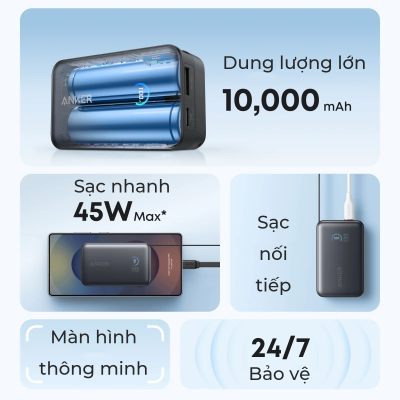 Pin sạc dự phòng 10000mAh Type C PD QC 3.0 45W Anker A1638 kèm cáp dây rút Type C là lựa chọn hoàn hảo cho người dùng cần một giải pháp sạc nhanh, an toàn và tiện lợi. Với dung lượng 10.000mAh, sản phẩm dễ dàng đáp ứng nhu cầu sạc cả ngày cho nhiều thiết bị như điện thoại, tablet, laptop mỏng nhẹ và cả Nintendo Switch.
