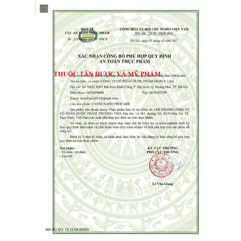 NHÃN HIỆU ĐƯỢC BÁC SĨ & DƯỢC SĨ KHUYÊN DÙNG NGUYÊN LIỆU NHẬP KHẨU TỪ MỸ CÔNG DỤNG: Bổ sung canxi giúp xương chắc khỏe, giảm nguy cơ loãng xương ở người cao tuổi. Giúp tăng cường sức khỏe, nâng cao sức đề kháng cho phụ nữ trước, trong quá trình mang thai và sau khi sinh ĐỐI TƯỢNG SỬ DỤNG: Phụ nữ chuẩn bị mang thai, phụ nữ có thai và cho con bú Trẻ đang độ tuổi phát triển, người già, người bị thoái hóa xương khớp. THÀNH PHẦN: Beta glucan .................................. 30mg Calcium nano........................... 1500mg Acid folic ................................. 600mcg Vitamin D3.................................. 300IU Vitamin C...................................... 60mg Boron Oxide............................... 750mg Zn gluconate................................... 2mg Mangan oxide................................. 2mg Cu sulfat.......................................... 1mg DHA (10%)................................... 30mg CÁCH DÙNG: Người lớn và trẻ em trên 12 tuổi: 1-2 viên/ngày Trẻ em 6-12 tuổi: 1 viên/ngày Uống vào buổi sáng sau khi ăn QUY CÁCH ĐÓNG GÓI: Hộp 1 lọ 30 viên sản phẩm này không phải là thuốc không có tác dụng thay thế thuốc chữa bệnh