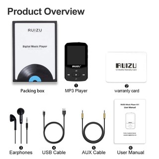 Model No: RUIZU-X52. Size Kích thước sản phẩm: 2,4 x 1,4 x 0,4 inch Kích thước màn hình: Màn hình LCD 1,5 inch weight Trọng lượng sản phẩm: 23g (chỉ thiết bị). Pin: Tích hợp pin lithium ion polymer 3.7V / 300mAh. Dung lượng bộ nhớ: Bộ nhớ 8GB tích hợp, thẻ TF lên tới 128GB capacity Dung lượng bộ nhớ: Tích hợp 8GB hỗ trợ lưu trữ mở rộng lên tới 128GB. Format Định dạng âm thanh: MP3 / WAV / APE / WMA / FLAC, vv ❉ Thời gian sạc pin: 1 ~ 2 giờ sạc đầy pin. Truyền dữ liệu: Sử dụng cáp USB kết nối với PC để truyền dữ liệu. Chế độ phát nhạc: Chế độ lặp lại, hỗ trợ chế độ Phát ngẫu nhiên. Ngôn ngữ: Hỗ trợ tiếng Anh và các loại ngôn ngữ khác mode Chế độ phát nhạc: Chế độ lặp lại (Lặp lại 1, Lặp lại tất cả), Shuffle Bộ chỉnh âm: Rock, Funk, Hip hop, Jazz, Classical, Techno, Custom. Đài FM: Ghi âm FM, Tự động điều chỉnh, Điều chỉnh thủ công, Cài đặt trước recording Ghi âm giọng nói: Tốc độ bit (512kbps, 768kbps, 1024kbps, 1536kbps) Định dạng ghi âm (MP3 / WAV / ACT), Cảm giác ghi âm (Cảnh bình thường, Cảnh cuộc họp) Sách điện tử: Chỉ đọc các tệp TXT (hỗ trợ đánh dấu) Function Chức năng khác: Lịch, Đồng hồ bấm giờ, Báo thức, Pedometer. 【Bluetooth】Hỗ trợ Bluetooth với khả năng truyền ổn định và khả năng chống nhiễu cao cho phép dễ dàng sử dụng cả trong nhà và ngoài trời và đảm bảo trải nghiệm chơi nhạc không dây dễ chịu. Bạn có thể phát nhạc qua loa Bluetooth thưởng thức âm nhạc một cách tự do