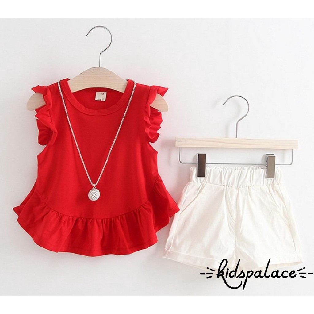 Gói hàng bao gồm: 1x Áo + 1x Quần + 1x Dây chuyền Bảng Kích thước 2 món: Kích thước nhãn chiều dài áo Ngực * 2 chiều dài quần Tuổi đề nghị 6 34 cm 27,5 cm 18,5 cm 6-12 tháng 8 37 cm 29 cm 19 cm 1-2 tuổi 10 40 cm 30 cm 20 cm 2-3 tuổi 12 43 cm 31. cm 22 cm 3-4 tuổi