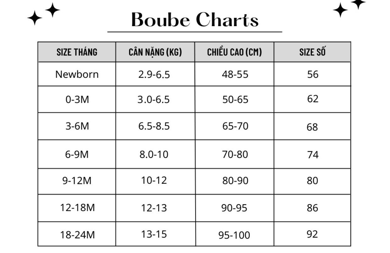 - Kích cỡ: size cho các bé có tháng tuổi: 0-24M, cân nặng: 3 đến 15kg