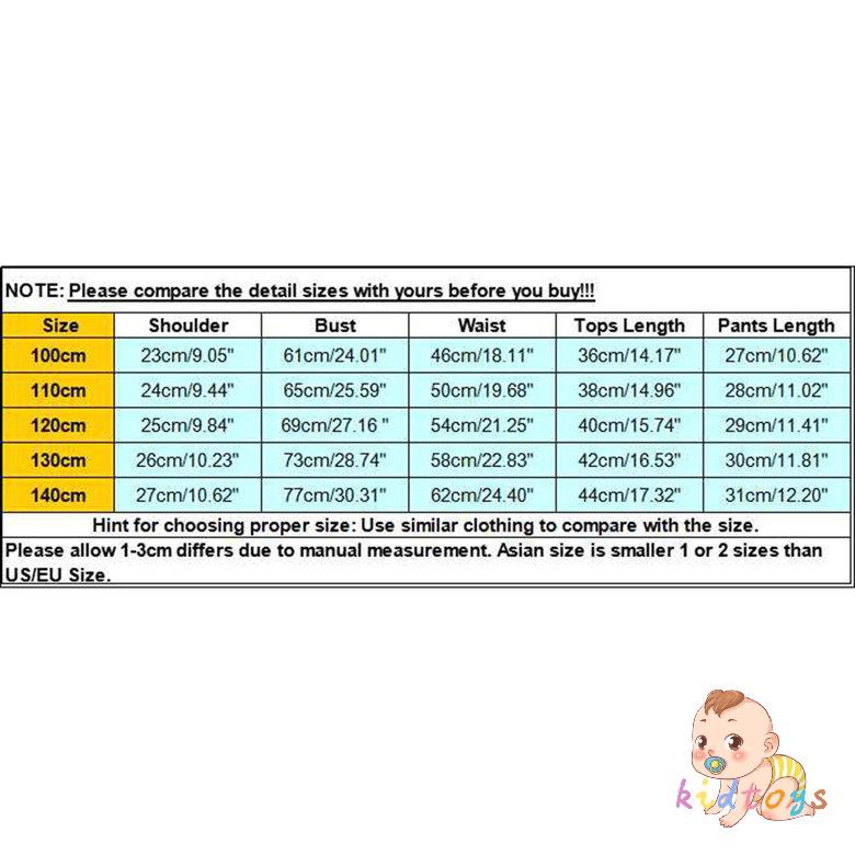 NOTE: Please compare the detail sizes with yours before you buy!!! Size Shoulder Bust Waist Tops Length Pants Length 100cm 23cm/9.05" 61cm/24.01" 46cm/18.11" 36cm/14.17" 27cm/10.62" 110cm 24cm/9.44" 65cm/25.59" 50cm/19.68" 38cm/14.96" 28cm/11.02" 120cm 25cm/9.84" 69cm/27.16 " 54cm/21.25" 40cm/15.74" 29cm/11.41" 130cm 26cm/10.23" 73cm/28.74" 58cm/22.83" 42cm/16.53" 30cm/11.81" 140cm 27cm/10.62" 77cm/30.31" 62cm/24.40" 44cm/17.32" 31cm/12.20" Hint for choosing proper size: Use similar clothing to compare with the size. Please allow 1-3cm differs due to manual measurement. Asian size is smaller 1 or 2 sizes than US/EU Size.