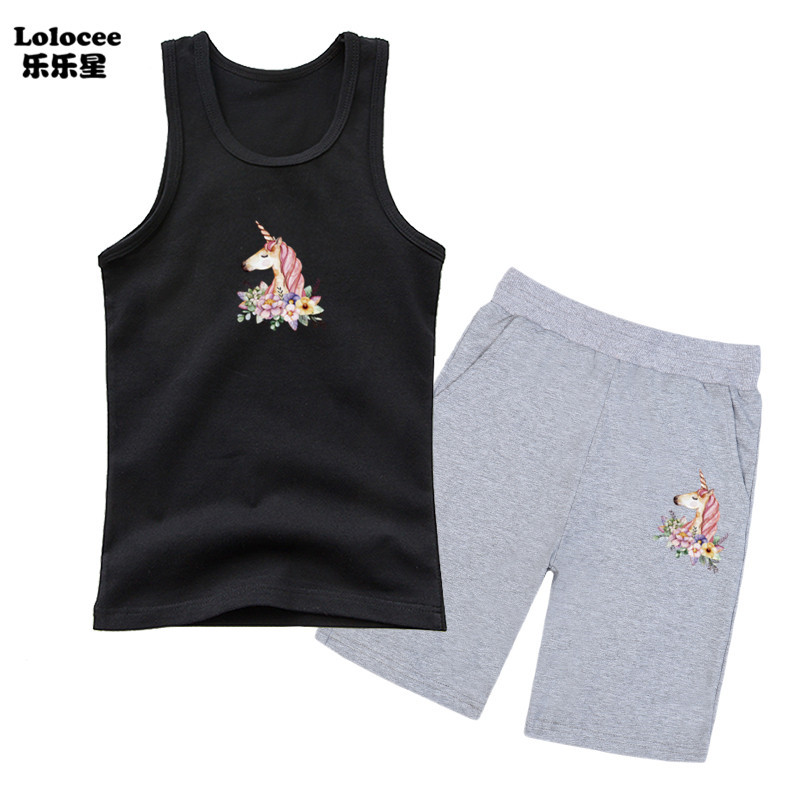 Bộ quần áo trẻ em mùa hè Bé gái Quần áo thường Phù hợp với bé gái Không tay Áo phông Unicorn Áo + quần đùi Bộ 2 mảnh