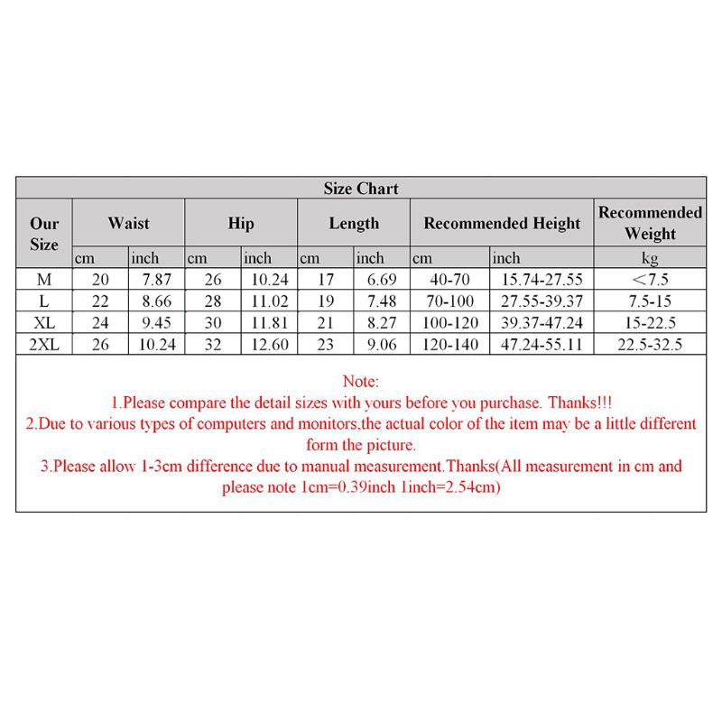 Specification: Material: Cotton Color: Random Color(If you buy more than one, you may receive the same color or several colors.) Size: M/L/XL/2XL(Chinese Size,follow the size chart to select please) Size:M Waist:20cm(7.87inch) Hip:26cm(10.23inch) Length:17cm(6.69inch) Recommended Height:40cm-70cm(15.74inch-27.55inch) Recommended Weight:<7.5kg Size:L Waist:22cm(8.66inch) Hip:28cm(11.02inch) Length:19cm(7.48inch) Recommended Height:70cm-100cm(27.55inch-39.37inch) Recommended Weight:7.5kg-15kg Size:XL Waist:24cm(9.44inch) Hip:30cm(11.81inch) Length:21cm(8.26inch) Recommended Height:100cm-120cm(39.37inch-47.24inch) Recommended Weight:15kg-22.5kg Size:2XL Waist:26cm(10.23inch) Hip:32cm(12.59inch) Length:23cm(9.05inch) Recommended Height:120cm-140cm(47.24inch-55.11inch) Recommended Weight:22.5kg-32.5kg Quantity: 1 pc