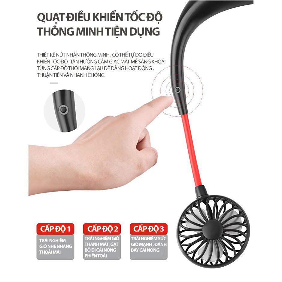 Tính năng sản phẩm Điều chỉnh xoay 180 độ để tận hưởng không khí hướng lên từ phía cổ. Phong cách rảnh tay sử dụng thuận tiện hơn. Phù hợp mọi lứa tuổi. Quạt có 3 tốc độ điều chỉnh Thời gian làm việc: từ 1-3 giờ tùy theo chế độ Sử dụng công nghệ giảm âm nên tiếng ồn tạo ra từ động cơ được triệt tiêu gần như hoàn toàn để bạn có được một làn gió yên bình. Quạt làm bằng nhựa ABS cao cấp, bền và ổn định. Pin và động cơ có thiết kế an toàn.