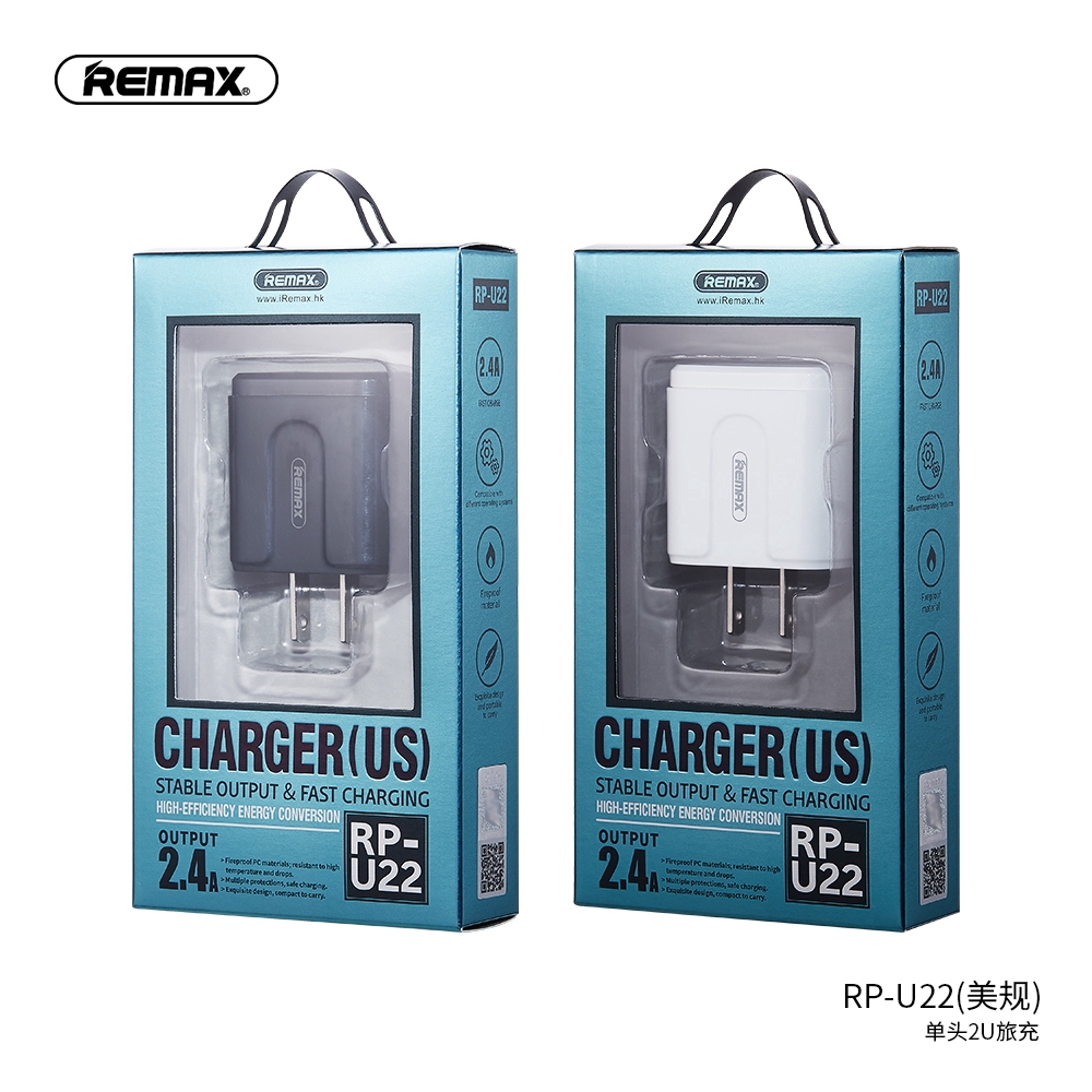 Brand Name: Remax Model number: RP-U22 Color: White,Black Plug Type: UK AU US Indian Plug Input:AC100-240V 50/60Hz 0.3A Output:12W DC5V2.4A USB Quantity: 2