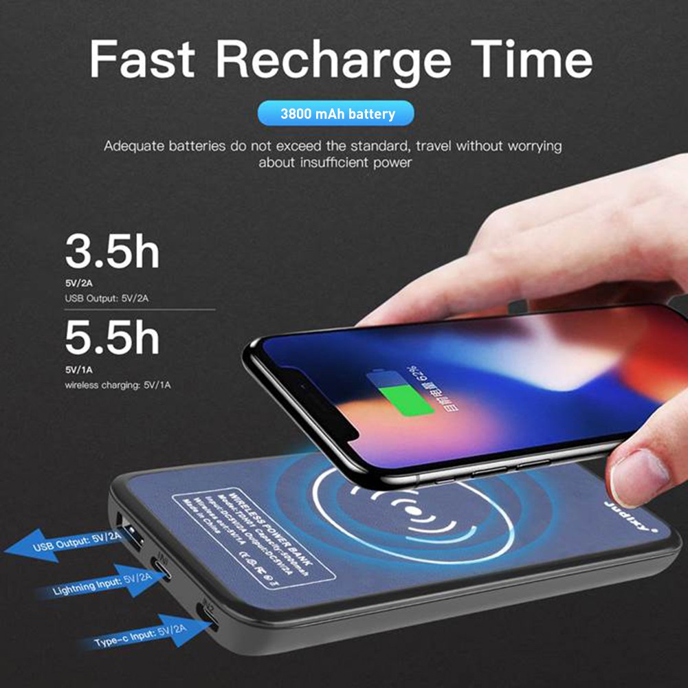 Specification: Model: TDHNX-5001 Mobile phone wireless charging: 15W (MAX) Power capacity: 3800MA Cell type: polymer lithium ion battery Shell material: plastic Size: 135*66*10mm Packing size: 162*92*32mm Color: sky blue, dark blue, pink Gross weight: 180g