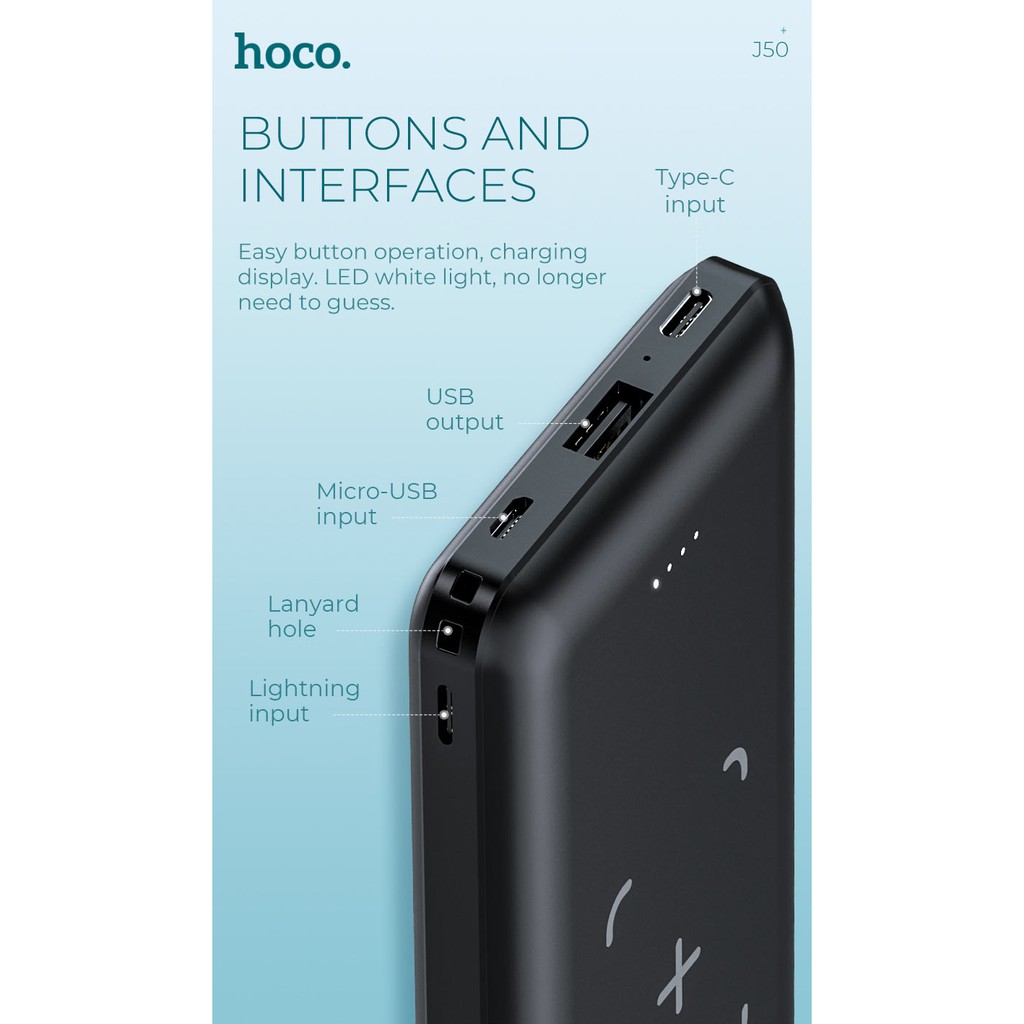 🌟🌟🌟 THÔNG TIN SẢN PHẨM🌟🌟🌟 - Hoco là thương hiệu nổi tiếng của HongKong với các thiết bị,phụ kiện điện thoại được người dùng tin tưởng.Là sản phẩm mới của HOCO, pin sạc dự phòng HOCO J50 sẽ đem đến cho người dùng trải nghiệm tiện lợi. - Dung lượng 1000mAh với hỗ trợ sạc không dây tiện lợi có thể sạc nhanh mọi loại máy có hỗ trợ sạc không dây (VD: Samsung S8/9/10, Note 8/9/10, iPhone X trở lên,...), ngoài ra pin còn có 1 cổng USB giúp sạc các thiết bị khác thông qua dây sạc. - Pin sạc dự phòng HOCO J50 được làm từ nhựa ABS và PC chống cháy nổ, pin loại A+ đem lại hiệu suất cao, sạc an toàn cùng lúc cả 2 thiết bị. - Với 3 cổng sạc MicroUSB, Lightning và Type-C giúp sạc đầy pin của bạn bằng bất cứ sợi dây cáp nào mà bạn có, ngoài ra hãng còn tặng kèm 1 cáp ngắn cổng microUSB.