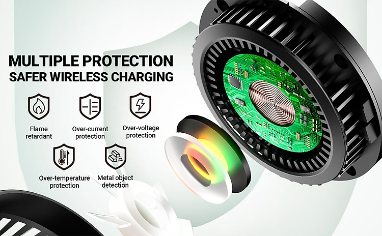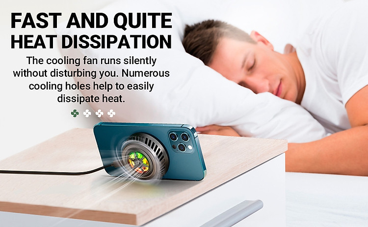 - Sạc nhanh không dây tích hợp quạt giúp tản nhiệt làm mát thiết bị nhanh chóng