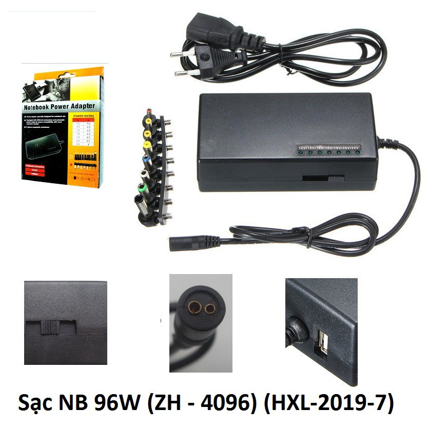 Sạc đa năng 96W ZH 4096 Out put cổng laptop: Có thể thay đổi điện áp tuỳ ý 12 V/15V / 16V / 18V / 19V / 20V / 24V (max 20V - 4.5A / 24V - 4A) Out put cổng USB: max 2.1A In put : AC 110-240 Công suất : 96W Sạc nguồn cung cấp năng lượng chuyển đổi phổ biến cho máy tính xách tay Bảo vệ Fucnctions: Bảo vệ quá tải, Bảo vệ ngắn mạch, cấp nguồn bằng nguồn chính Kèm 8 đầu thay đổi, phù hợp nhiều loại máy tính (quý khách xem hình mô tả kích thước từng đầu kèm theo) Công tắc chỉnh số Volt phù hợp với dòng máy tính đó