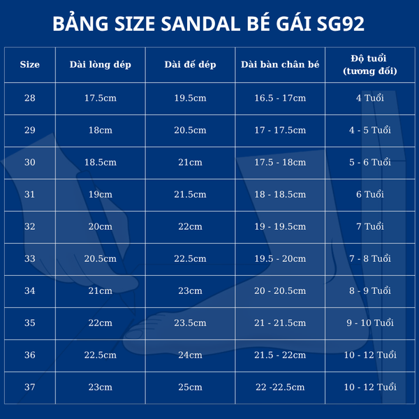 BẢNG SIZE SANDAL BÉ GÁI SG92