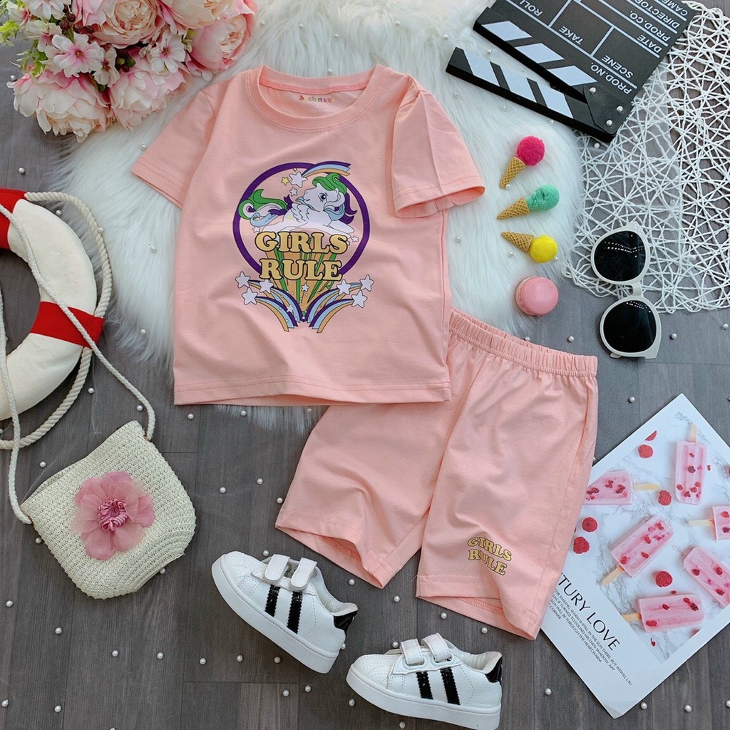 Giới thiệu sét 2 bộ đồ cho bé gái quần lửng ngựa RULE in cầu vồng đáng yêu từ 7kg đến 25kg