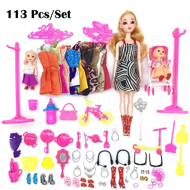Package includes: 3 dolls(1 big doll + 2 small dolls) 12pcs doll dresses 98pcs doll accessories( including shoes, jewelries, bags, glasses, kitchen toys, cleaning toys, bikes, scooters, baby carriages, doll stand and so on) Product specifications: Dresses are suitable for 28cm-30cm dolls to wear, comes with matching doll stent for you to fixate the doll easily, and for kids to dress up dolls more conveniently. Product material: Dresses are made of high-quality fabrics, with soft touch, with Velcro on the back, easy to wear and get off. Large number of clothing categories: dresses in a wide range of different styles and prints, such as striped, fluorescent colorful, polka dots, cute floral and charming rainbow. Perfect gift: dressing up doll pack is every girl's dream gift, and our super big package is ready for you to bring a nice surprise to your children.